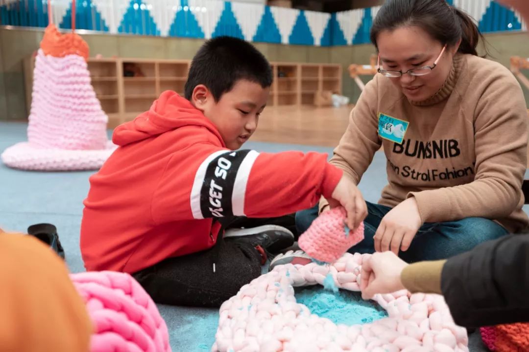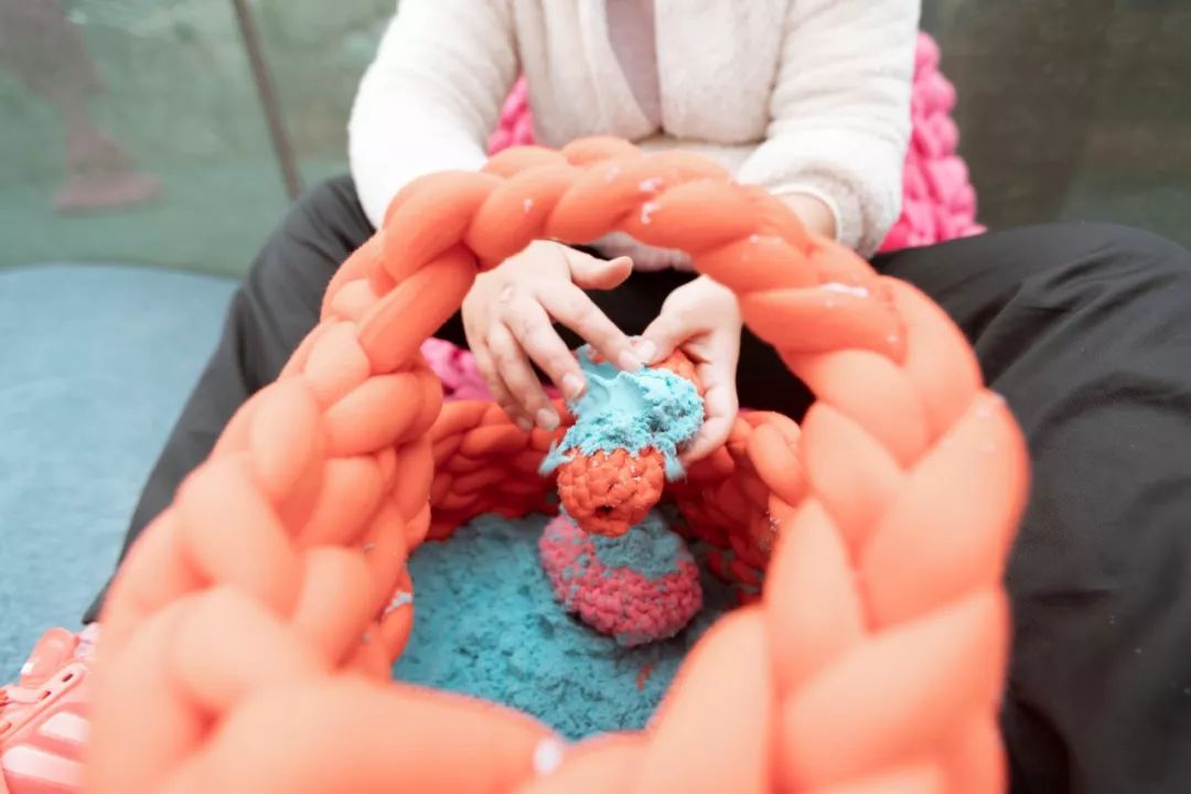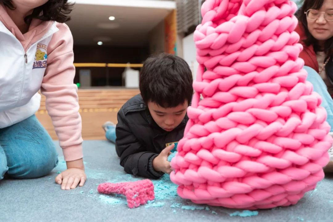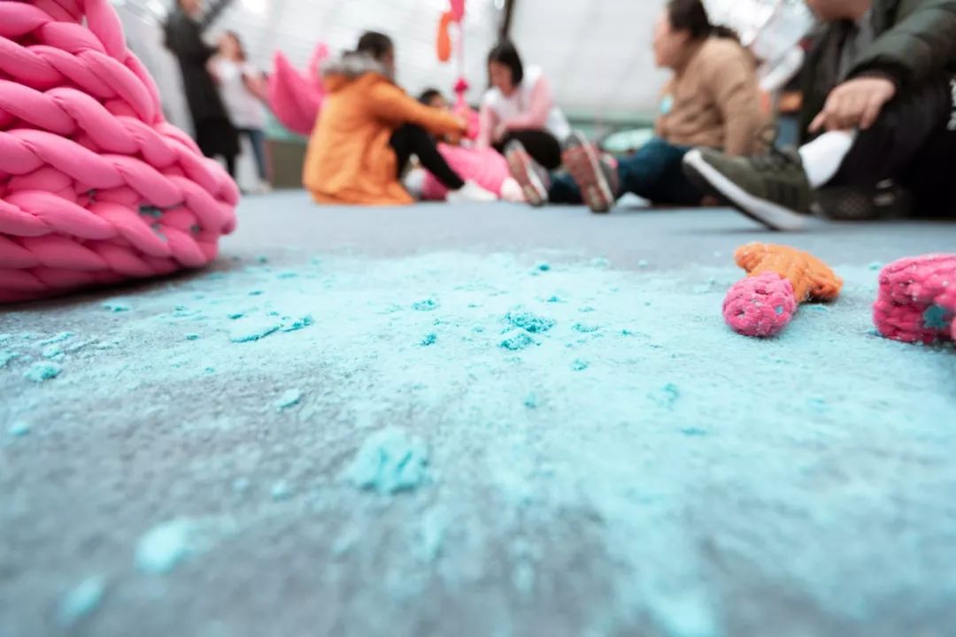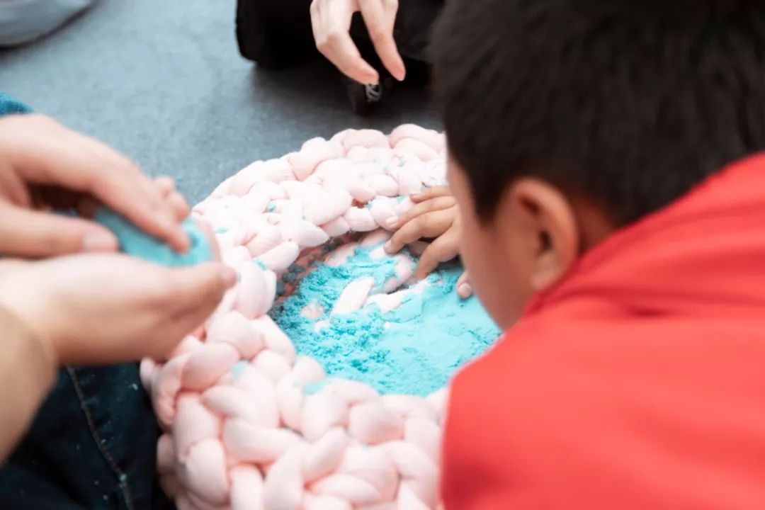艺术家引导小朋友们感受太空沙的触感,并与小朋友们互动。小朋友们进入作品区域,自由触摸、感受织物柔软的触感,并在不同形态的织物之间爬行、穿梭。