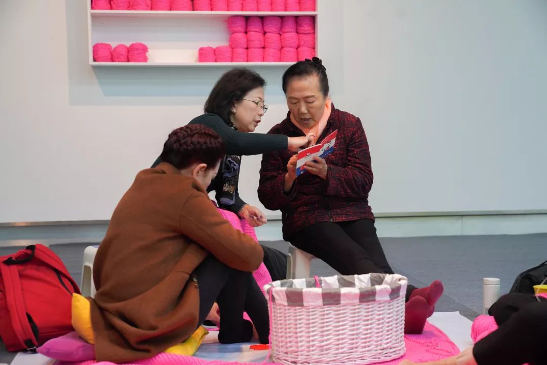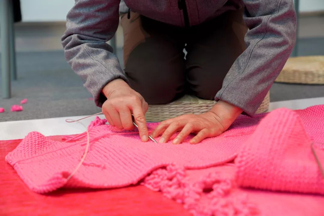 工作坊中的十几位专业组阿姨非常辛苦,除了每天配备两位在现场值班,告诉大家怎么织,织多少针,到最后100位编织达人接力织完10块帽子局部后,也由这支专业阿姨编织队来负责收尾拼缝成型,以及完成整个帽子难度最高的眼睛鼻子部分。