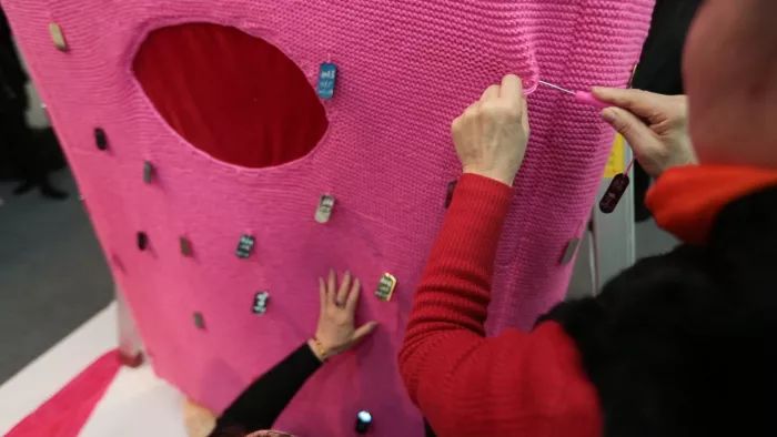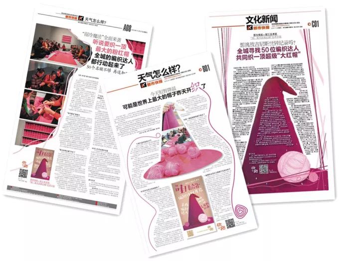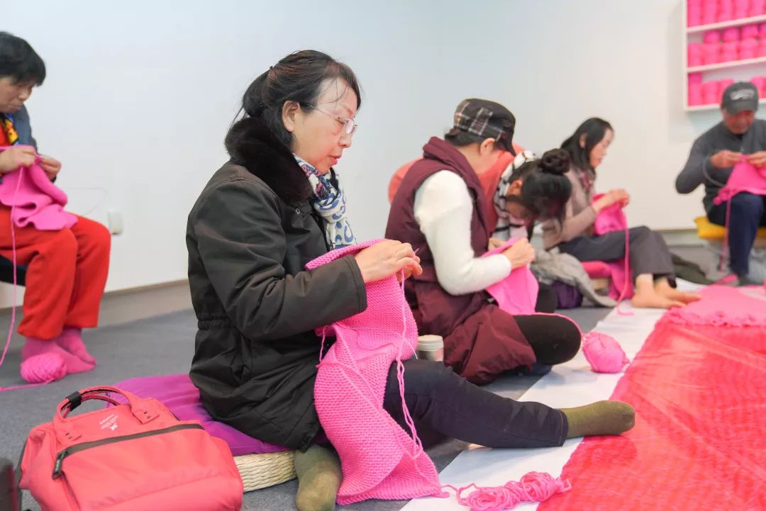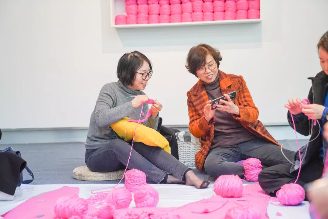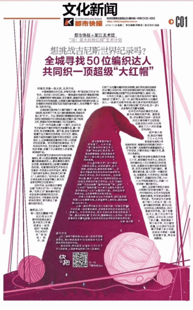 本届“无界之归”三年展期间,浙江美术馆和都市快报再次共同发起“哇!最大的粉红帽”艺术计划,邀请100名编织达人,一起织一顶3米多高的巨无霸毛线帽。