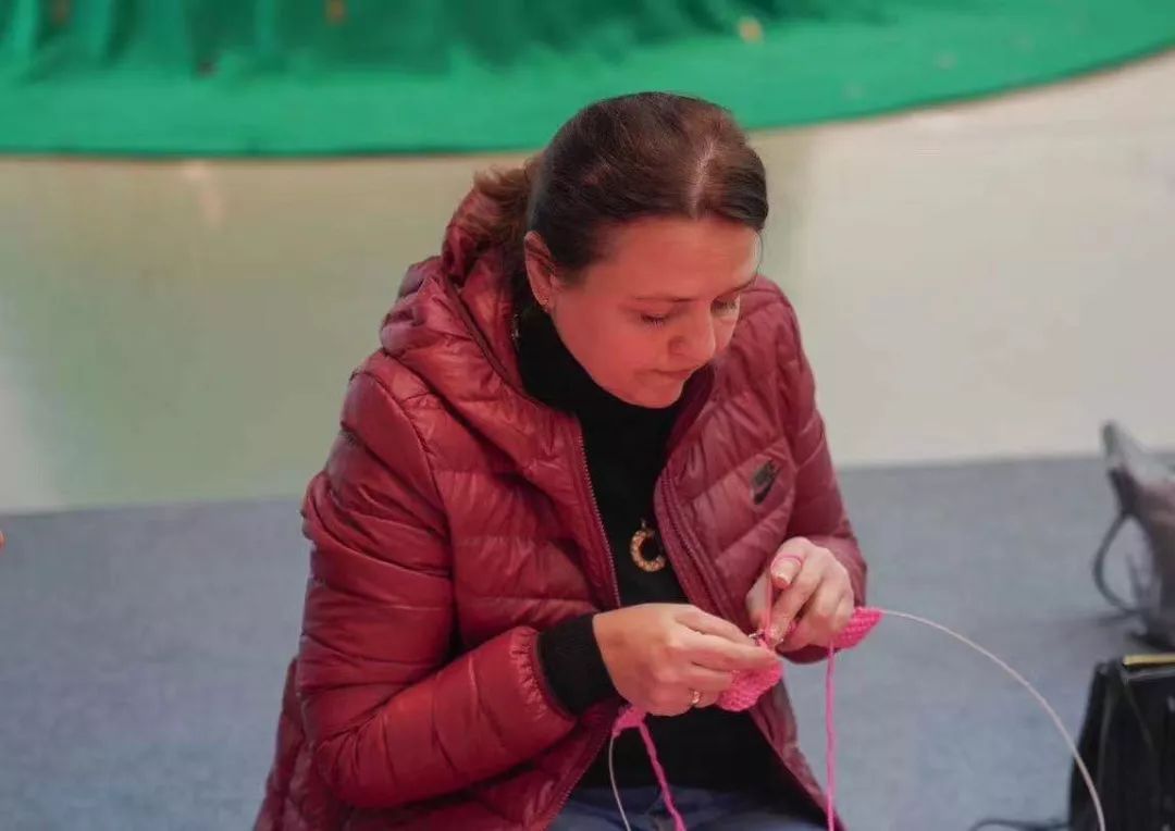 现场热情的杭州阿姨们纷纷表示,哟,外国友人,我们来教你呀,包学包会!一位阿姨把自己刚起好头的针线递给Nata,正想教她该如何往下织,谁知Nata接过毛线针,会心一笑,迅速上手开织,又快又好,“原来她会啊,还是个老手!”阿姨们用全球通用的点赞方式,集体给她竖了一个大拇指。