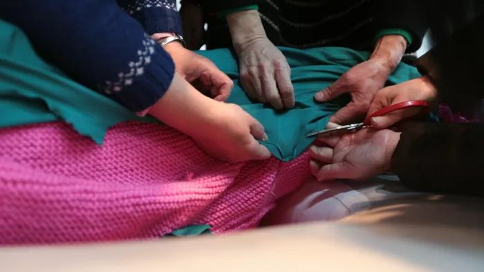 收尾日,专业组的骨干阿姨们几乎都来帮忙了,她们中的很多人已经来过四、五次了。比如,全场“技术指导”俞慧,帽子最终怎么拼怎么缝,就是她主导完成的。