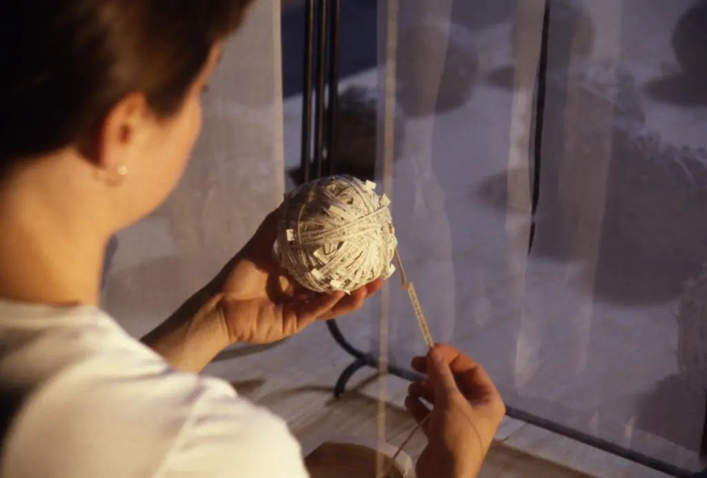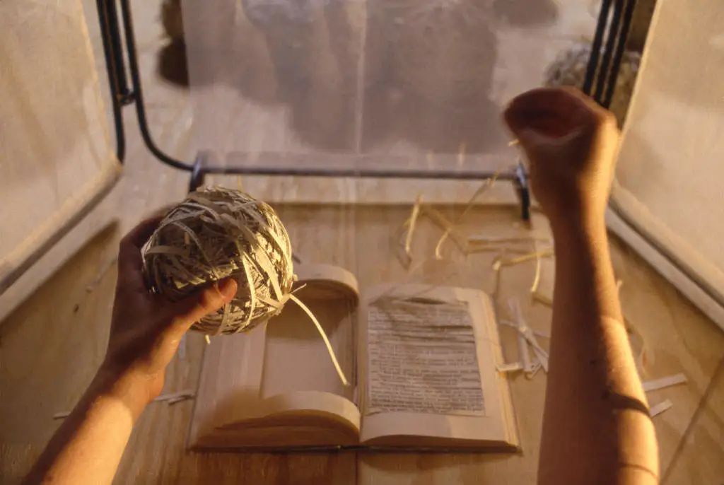 《线型》最初创作于1994年。在此次浙江美术馆新版本的装置作品中,两位表演者将在一张长桌的两端相对而坐,拿起面前经过切割的纸张进行卷绕:一端是一本中文印刷物,另一端则放有一本英文书籍。纸张均以之字形切开,作为连续不断的线被卷起,好似从织布上扯出一条连续不断的线条。由此,二维的页面变为手工塑形的三维物件,徐徐堆积于空旷的桌面。在这连续不断的缠绕中,平面变为球体,矩形变为圆圈,正变为负,字词(text)变为织体(textile)。