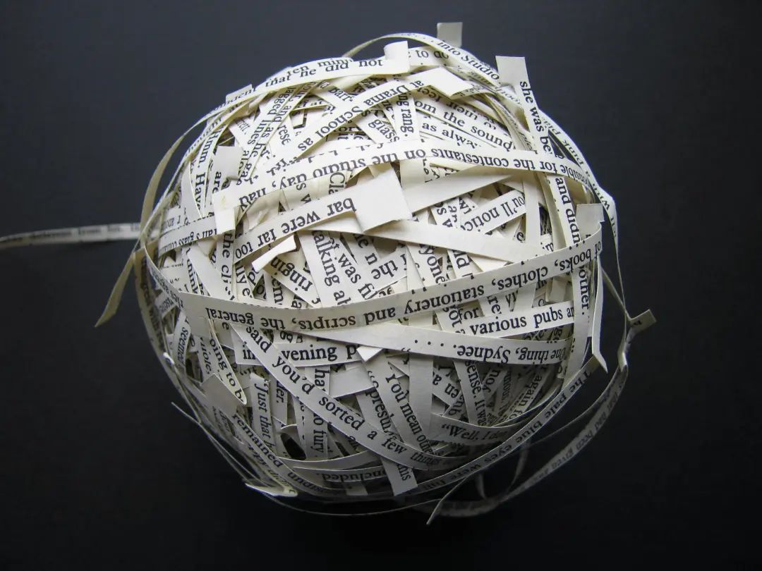 长条文本制作的缠球、书籍、木头、布料 Ball wound from strips of text, book, wood, cloth