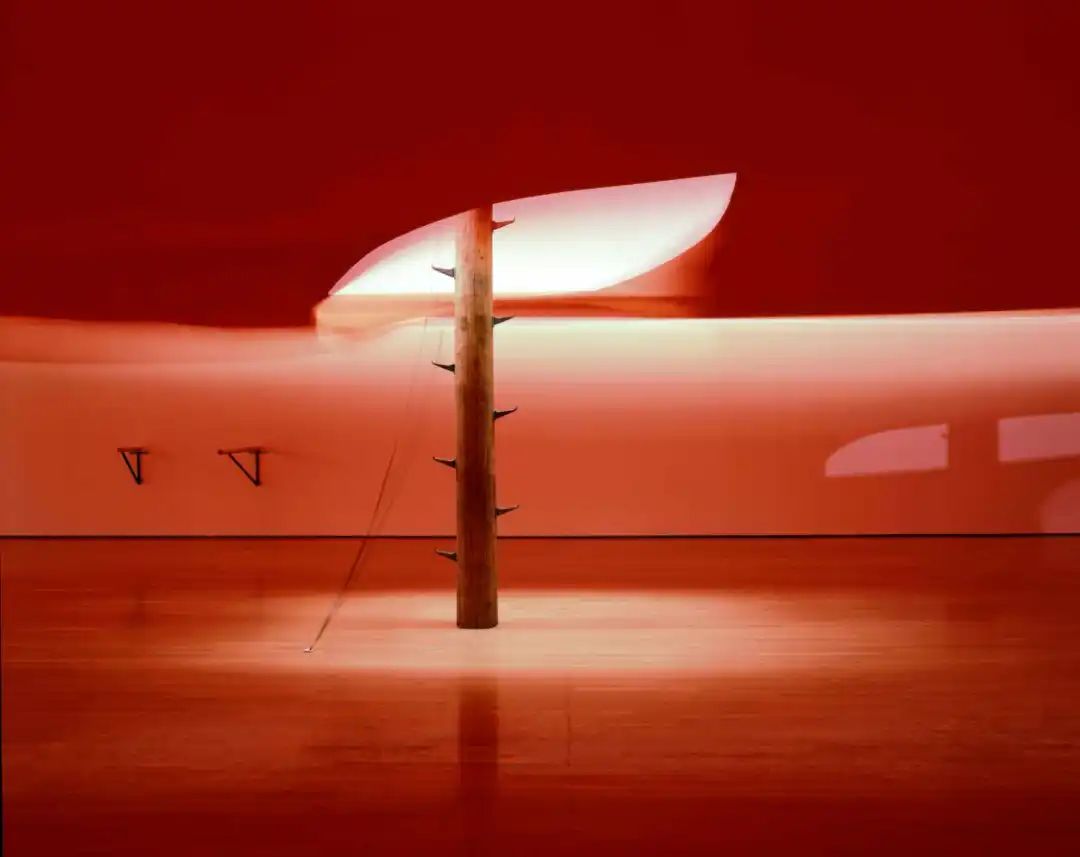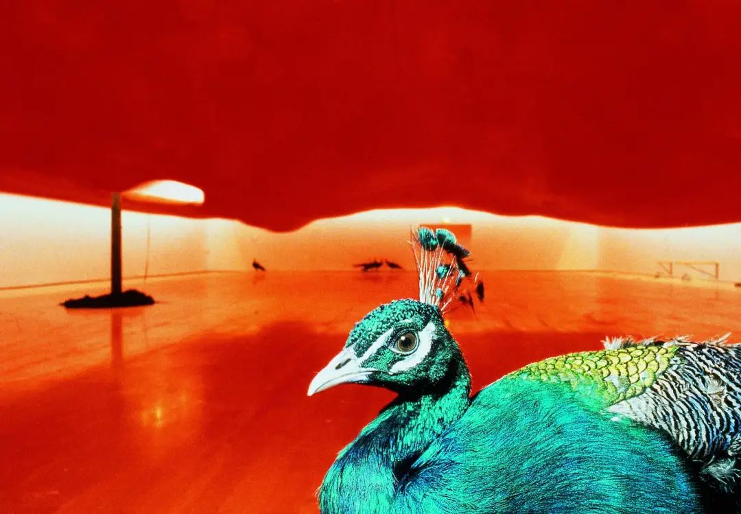 关系 mattering安·汉密尔顿 Ann Hamilton里昂现代美术馆,里昂,法国 Musée d'art contemporain de Lyon, Lyon, France橙色丝绸,活孔雀,电线杆,六个壁挂式栖木,服务员,瓷制墨盒,带墨打字机色带,声音 orange silk, live peacocks, utility pole, six wall-mounted perches, attendant, porcelain inkpot, inked typewriter ribbon, sound1997图像由蒂博·让松,布莱斯·阿迪隆惠允 Photo credits: Thibault Jeanson, Blaise Adilon