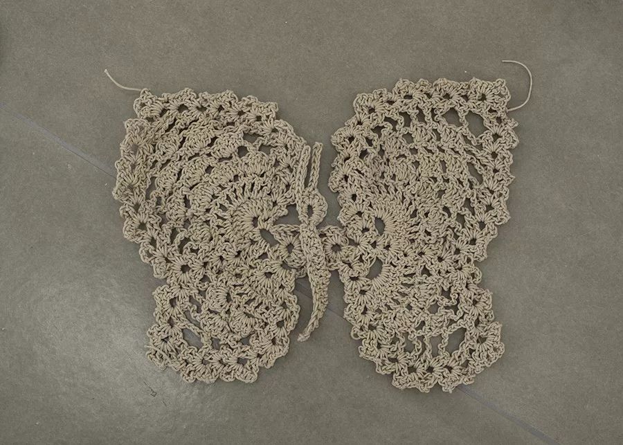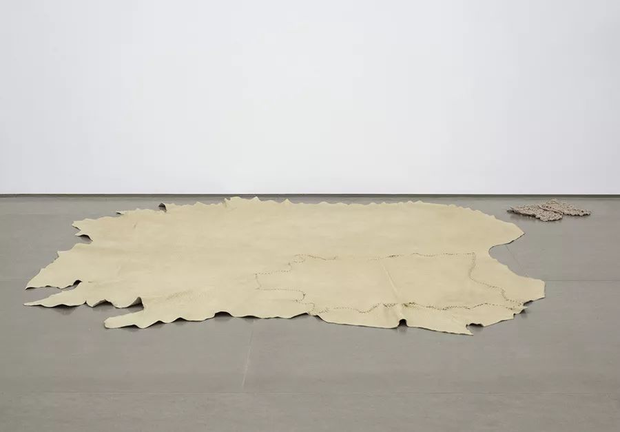《珍藏我》,是在一大块牛皮上裁剪出一整张山羊皮的形状,然后再用线重新缝合到原来地方,旁边则是一只用钩针棉线织的蝴蝶。
