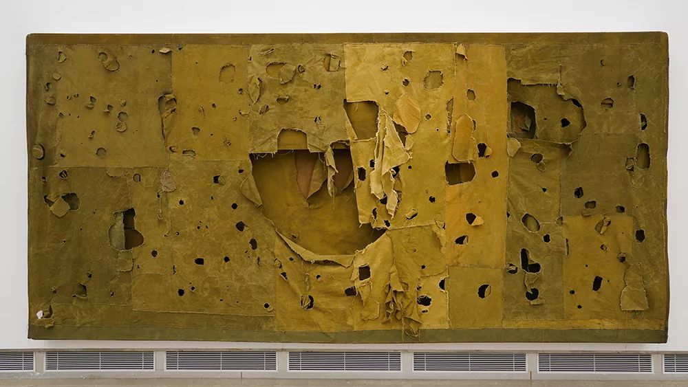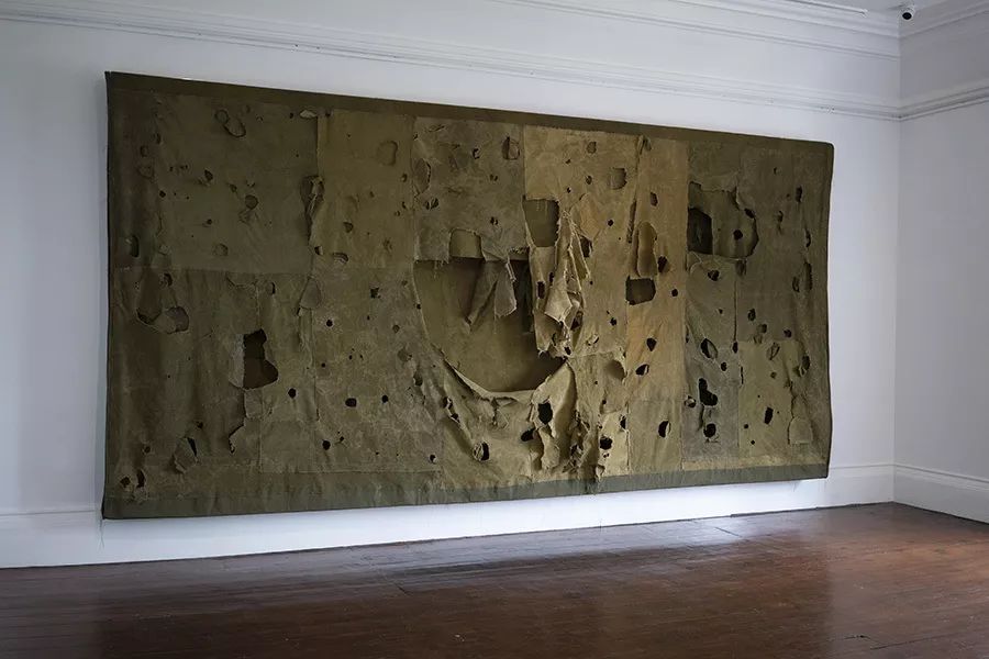 《国家登记》是我所说的“接触”绘画。这件作品取材于威尔士北部的风景,当时我正在和考古学家一起挖掘一个铁器时代的山岗。我把浸透了彩色胶画颜料(用兔子皮胶混合了火星黄和灯黑颜料)的画布带到现场。我把它直接放在考古挖掘的表面,把能感觉到与下面地面接触的地方标记出来,并刺穿了画布。我把所有剪下来的画布碎片都放在山上,等画布变软后再带回伦敦的工作室,把它们缝合在一起。我认为这幅作品是一幅以风景为基础的绘画,与英国的风景传统息息相关,但这幅作品是与风景实际接触的结果,而不是风景的形象。