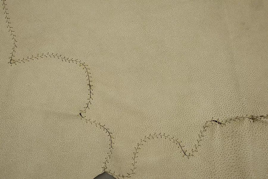 《珍藏我》 pin and mount me 牛皮、筋、棉线 Cowskin, sinew, cotton thread 尺寸可变,由两部分组成 Dimensions variable, 2 parts 2018