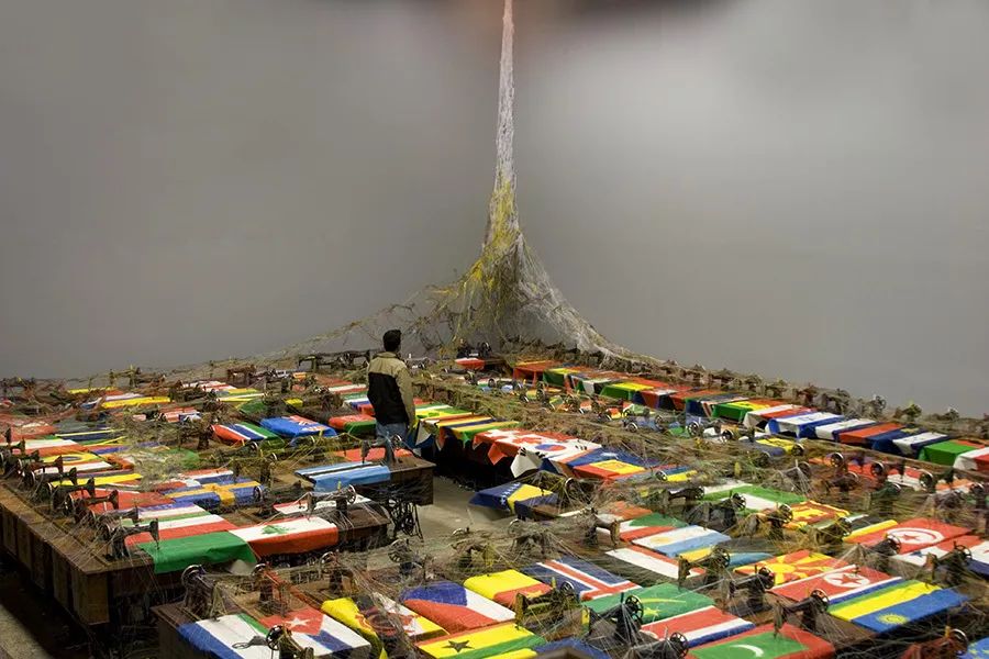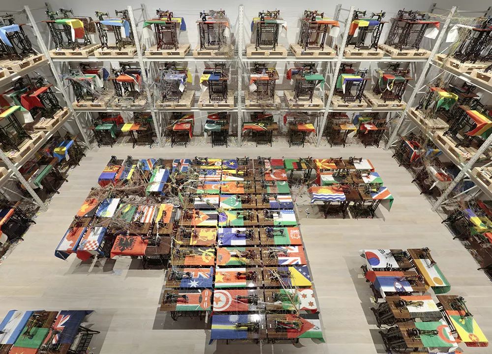 N.S. 哈沙创作出令人印象深刻的装置作品,将旗帜的历史和能量发挥到了极致。《各国旗帜》由192 面铺在同样数量的脚踏缝纫机上的国旗构成,象征着所有联合国会员国。