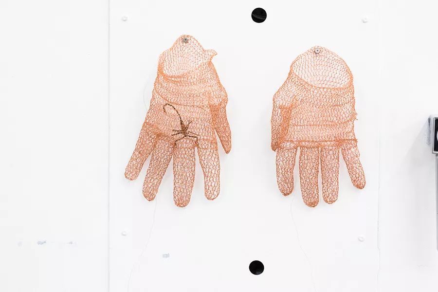 《铜手》是在艺术家自己的双手上用铜线钩编而成的,还包括一只艺术家在墨西哥买的铜线蝎子。在墨西哥祖父的农场里,与其祖父一起工作时,艺术家曾被蝎子蛰到了手指。