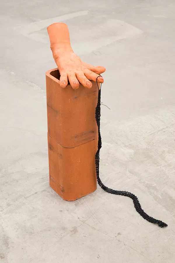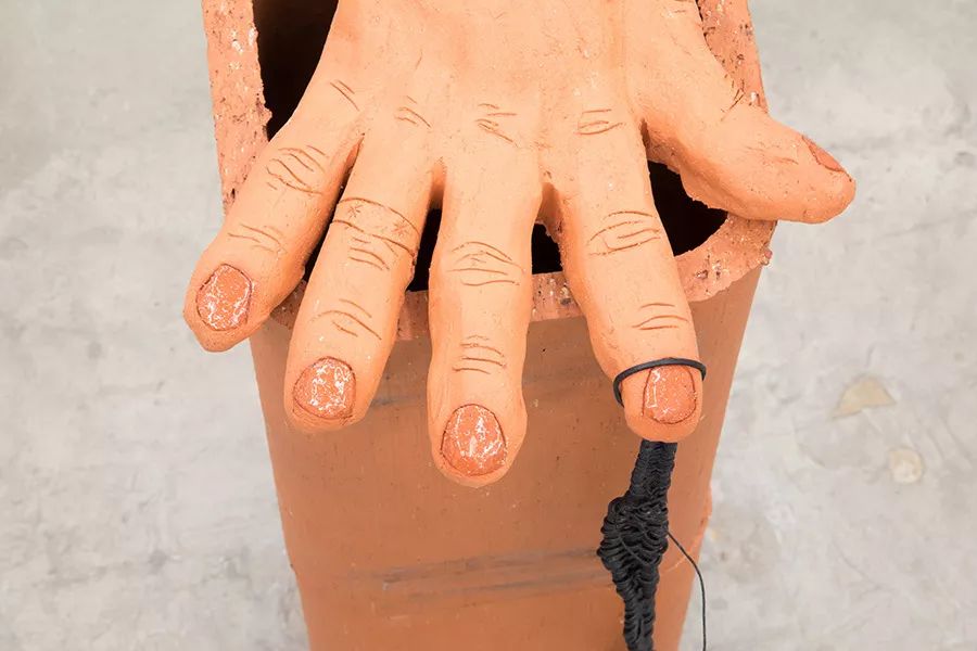 《泥手》是用赤褐色的陶土制成一只超大的手,手指周围绕着一条编织的皮革,暗示着用手做的动作。