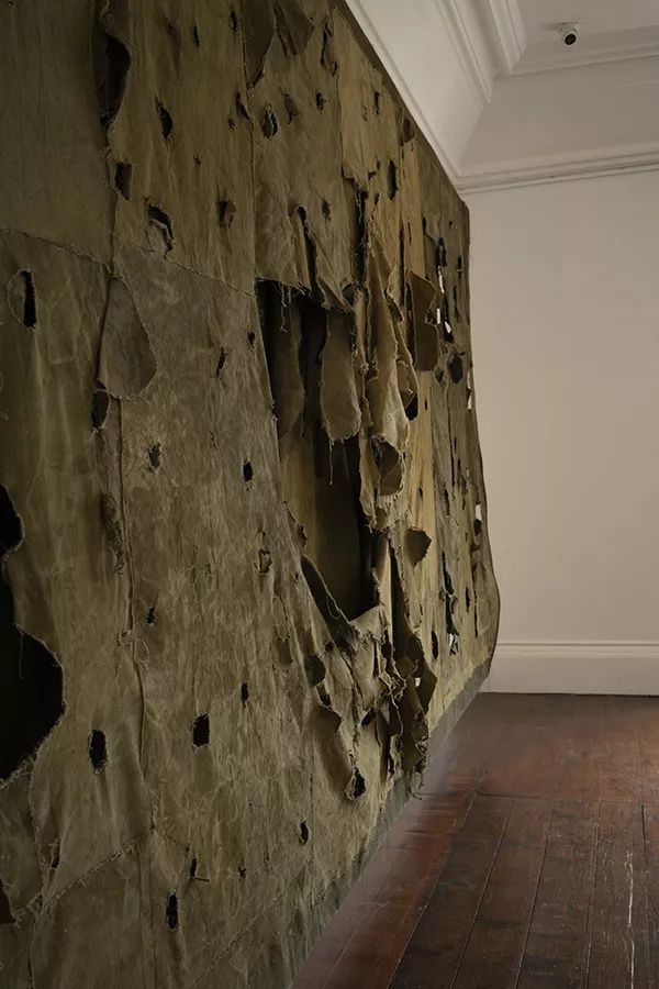 《墙边(叶子)》 Wallspine (Leaf) 帆布、涂料、细线、铝、钢支架 Canvas, distemper, thread, aluminium and steel brackets 206cm×236cm×84cm 2015