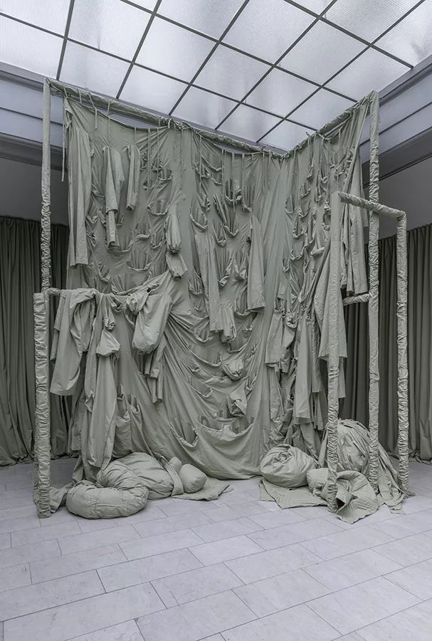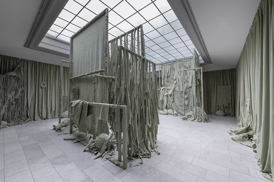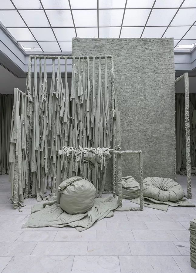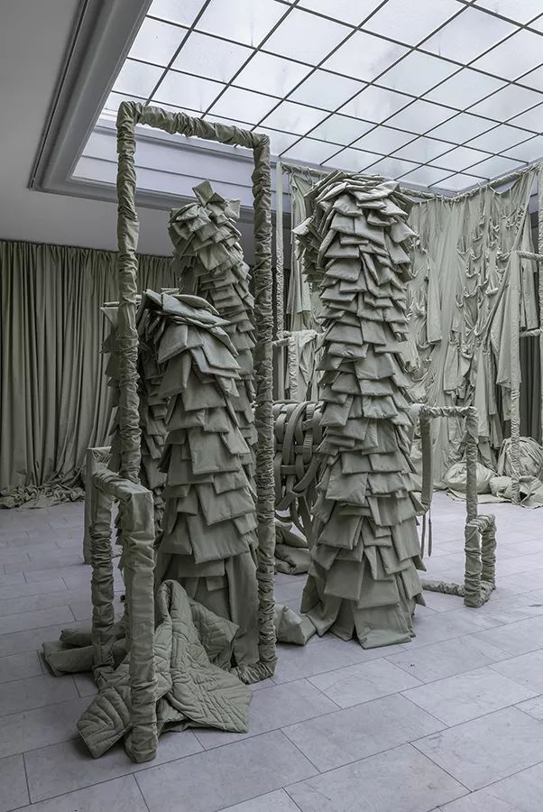 《当一切尘埃落定》(2019)这件装置作品充满了整个房间,除了视觉效果外,还会带来多种感官冲击。在寂静中充满着浓重且温暖的氛围。行走在装置作品里,仿佛置身于温室、红树林或原始森林之中。有些地方光线经过了过滤,不过也有明亮之处与浓重的阴影。单个作品的边缘互相交错,似乎被哑光面料的浅绿色连接在一起。观众慢慢地会意识到它们在尺寸、体量和细节上的明显差异,人们逐渐形成对装置的整体感受。人们探索的意识将使我们在装置内来回走动。