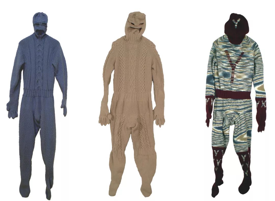 毛衣人2 Sweaterman 2,毛衣人3 Sweaterman 3 ,Y形人 Y-Man,尼龙线手工针织、纽扣 Hand knit acrylic, buttons 203.2cm×58.4cm×15.2cmx3,2005