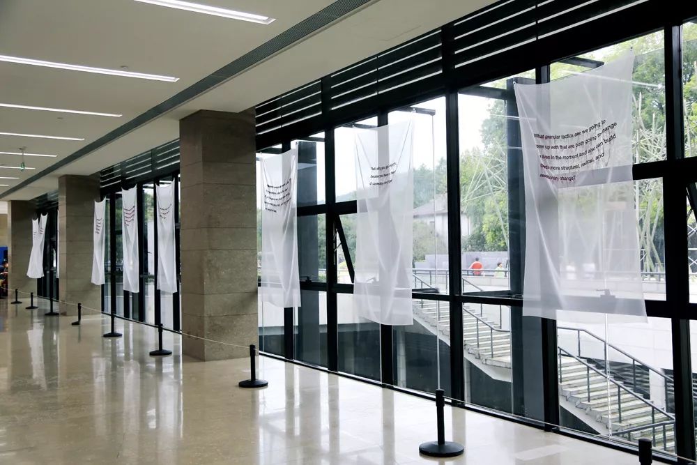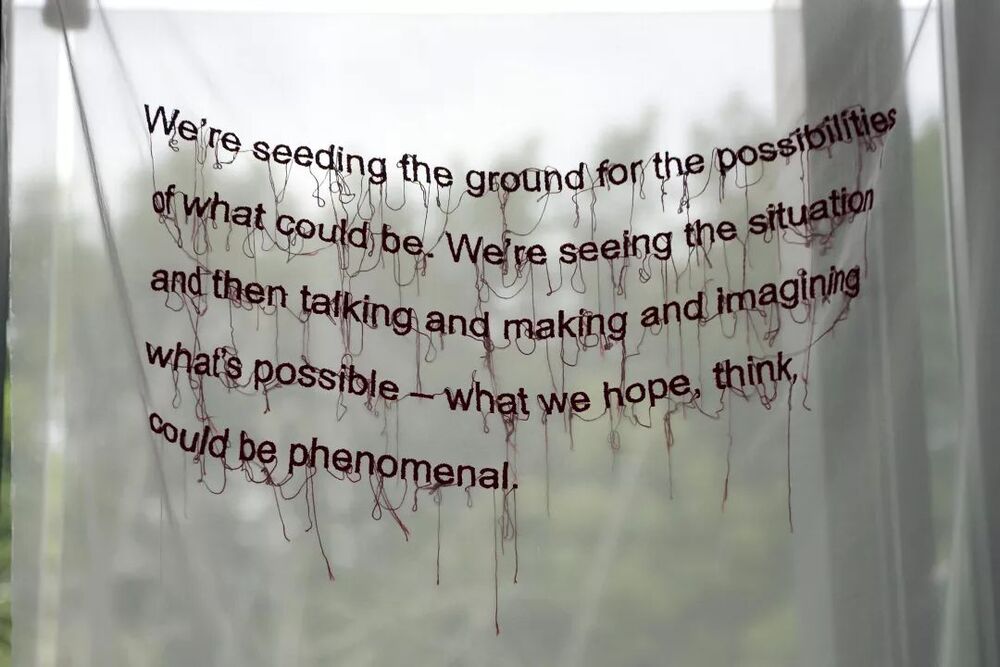 《线上的身体》这件作品是手工绣成的文字,这些文字摘自塔里·温伯格与其他女性活动家、艺术家以及学者之间的对话。这些对话围绕着将身体置于流水线这一行为在今天的意义。这一系列作品灵感来自于一家位于新泽西州帕特森艺术工厂。帕特森这座小镇的主要产业是丝绸制造业,劳动力都是劳工阶层的女性。她们将身体置于工作流水线之上,以保证更好地工作。不论是在工厂的流水线还是罢工的警戒线上,女性都在冒着生命风险捍卫尊严和权力。实际上,每一个行走在街上的人也是如此,为了能在公共空间里拥有自主移动的权利而冒着生命安全的风险。或许帕特森丝绸工厂的女工在时间和空间上都离我们很遥远,然而,女性群体依旧不断地将自己的身体置于多种意义的“线”之上,以各种方式让我们与她们以及其他更远的时空之间的关系变得亲密。