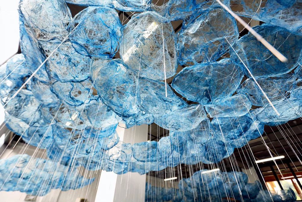 《之后(愈天)》是一个在地创作的装置作品,造型精致巧妙,把纤如蛛丝的丝纤维精心制作成如空气般轻盈的元素。装置上的每个半球元素都是从一个蚕茧里小心翼翼地拉出蚕丝,然后轻轻地上浆,采用蓝晒法让其沐浴阳光,最后得到各种各样的浅蓝、深蓝色调。装置灵感来源于中国古代女娲传说和她的“补天”壮举。女娲娘娘不仅仅创造了人类,还修补了天空,并保护人类的生存。女娲与一般女性并无二致,以创世者和治愈者的形象呈现自身。她的行动呼应着普通妇女的日常劳作;孕育生命、纺织、修补、照顾他人、治愈疾病以及让人类得以生存和成长。装置借用通常视为简单的妇女家庭劳动,如编织、缝纫,以雕刻、联结的方式形成岩石般的造型,如无形的云彩悬浮于空中,喻指传说中的天空。在蓝晒法过程中,阳光改变了材料,并为其印上了极美的天蓝色调。来自于天空的太阳光,其能量和印记灌输入装置的物质性之中。
