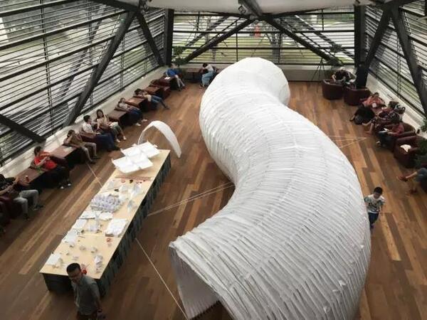 这边的纸构建筑是中国建筑师张永和的作品,探讨了如何用“建筑营造”来回应“纤维编织”这个有趣的问题。材料采用的是杜邦纸,是一种非常轻的、透光很好的材质。支撑的一段段小“肋骨”用的是泡桐木,这可以算是一种最轻的木材。我们传统观念中的“建筑”是坚固厚重的,而“纤维”则柔弱轻薄,易牵拉难承重。所以张永和的非常建筑事务所尝试从材料自身的结构性出发,探索如何把轻薄的纤维材料变为自支撑结构体系,从而搭建起一个提供荫蔽、玩耍、休憩的超轻拱。如此小的建筑,却不仅仅是一个简单的通道拱,我们站在建筑的入口看不到出口,因为建筑师的目的不只是让纸建筑得以建构起来,还希望有起承转合,让人们愿意进入,形成有意思的空间。