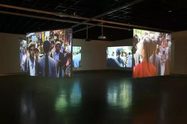 金守子的这个影像装置叫《针女》,她穿着最朴素的衣服,简单地扎着长辫,背对着摄像机,就这样一动不动站在车水马龙的城市人流中间,持续大概半个小时到一个小时。周围的人群,就从她身边穿过,做出不同的回应。她说每个城市的人们的回应都非常不同,有些城市人们会驻足观看,甚至窃窃私语,有些城市人流就这样匆匆擦肩而过,仿佛她不存在似的。她的身体就如一根针一样固定在城市的繁华街道中,记录下不同人群的反应。不同的国家,不同的文化,不同的肤色,不同的人种,在这一系列中体现得非常明显。《针女》这个系列在许多地方展过,但是像这次以六边形的平面展示,还是第一次。艺术家的初衷是希望能够让观众在屏幕的里外两面都可以观看,有一种置身其中、被环绕的感觉。