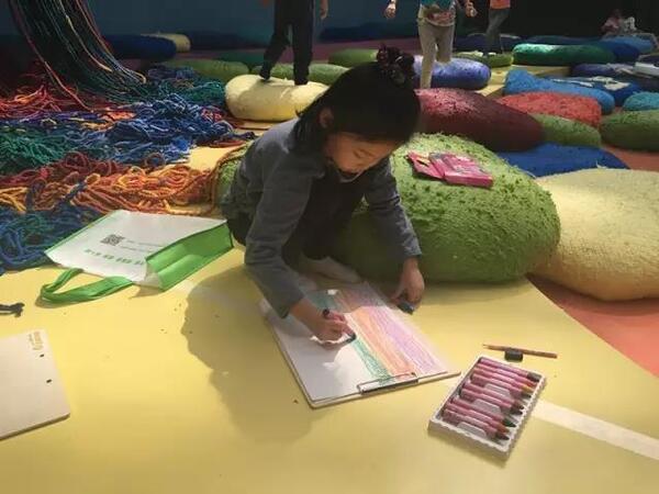 |小朋友在大型互动装置《纤云弄巧》上画画