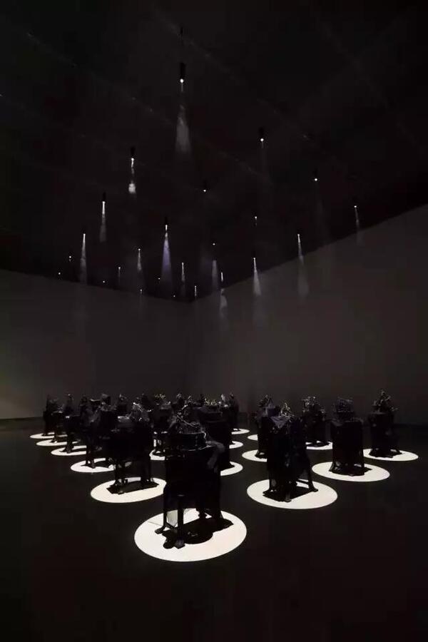 大家知道诸暨大唐吗,现今全世界约有40%的袜子都是从这里生产的。如今大唐面临改革整合,许多小厂都关闭了要合并成为大厂。于是有许多老袜机被淘汰,艺术家许江和景观建筑师袁柳军的作品《山水离歌》就是用来自大唐的次品黑丝袜和金属线,重新包裹那些废旧的袜机,令它们在美术馆空间中重新成为主角。大家可以听到这些嘈杂的声音,就是袜机在工厂里工作时的运转声音。这些老袜机的淘汰,代表着一个时代的逝去。但是,通过艺术创作,我们还能赋予它新的生命。我们把最硬的机器和最软的袜子重新编织起来,通过包裹、捆扎、重塑,老钢铁、老织机被软化为一种梦,一种交织着工业时代的乡愁的梦。聚光灯的照射下,烟雾的笼罩中,一台台需要四个工人才能搬动的黑色袜机呈现舞台中的戏剧性效果,似乎变得缥缈轻柔。这是现代织业的离歌,这是真实的工业山水。