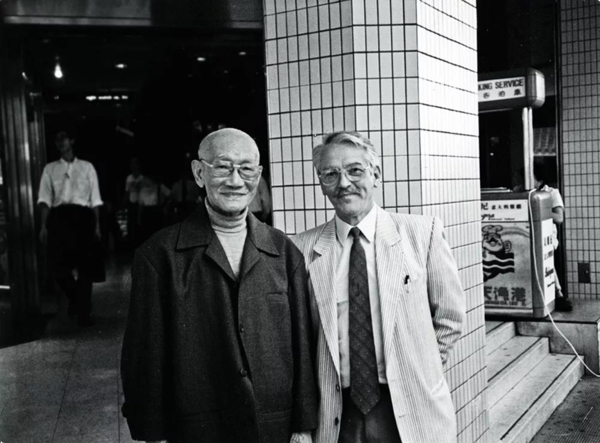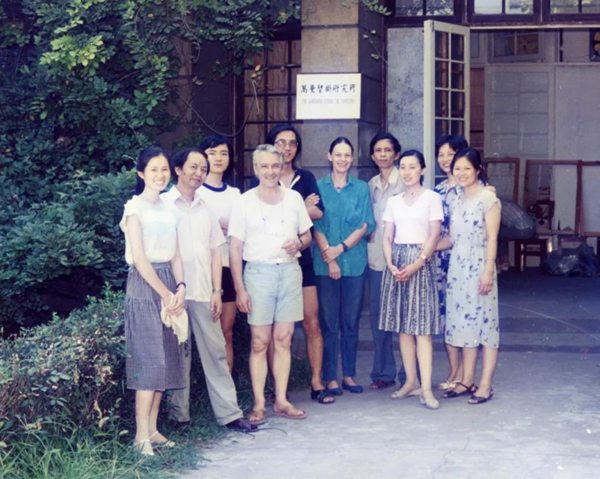 1986年,工作室成员与万曼在研究所门前合影。左起:施慧、陈仲常、刘正、万曼、王一波、冉娜·班尼尔、卢如来、朱伟、李健健、曹卫红