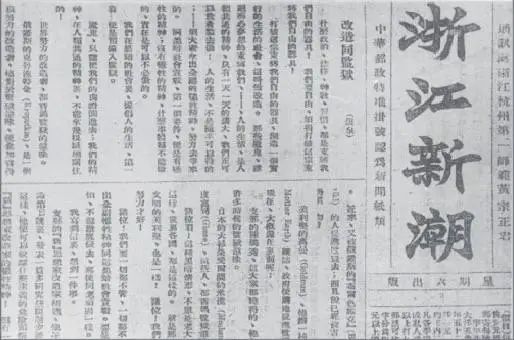《浙江新潮》第一期创刊于1919年11月1日。《发刊词》提出:“本周刊的目的,无非想把人类从黑暗变为光明,从伪道变为真理,从兽性变为人道。”知识分子应“投身劳动界中,和劳动者联合一致”,“促进劳动界的自觉和联合,去破坏束缚的、竞争的、掠夺的势力,建设自由、互助、劳动的社会。”此报仅存在了三周,发行了三期便遭查禁。