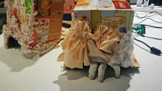 作品材质:植绒面料、棉花、法兰管、舵机、距离传感器