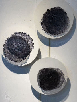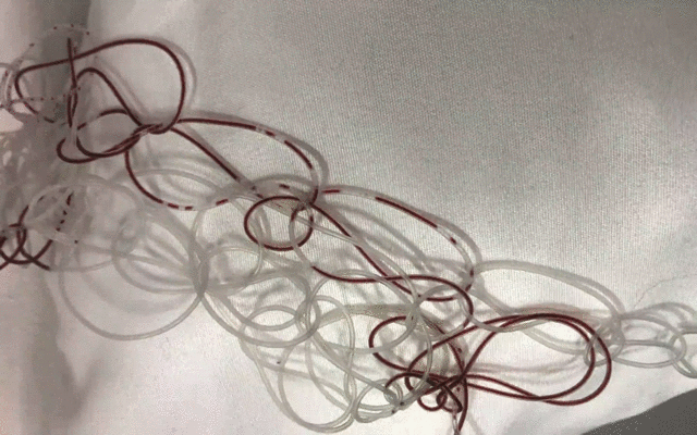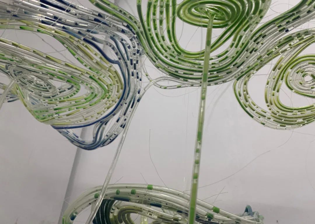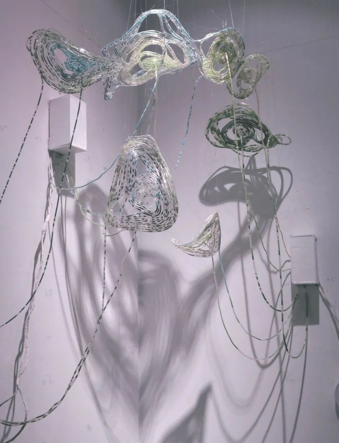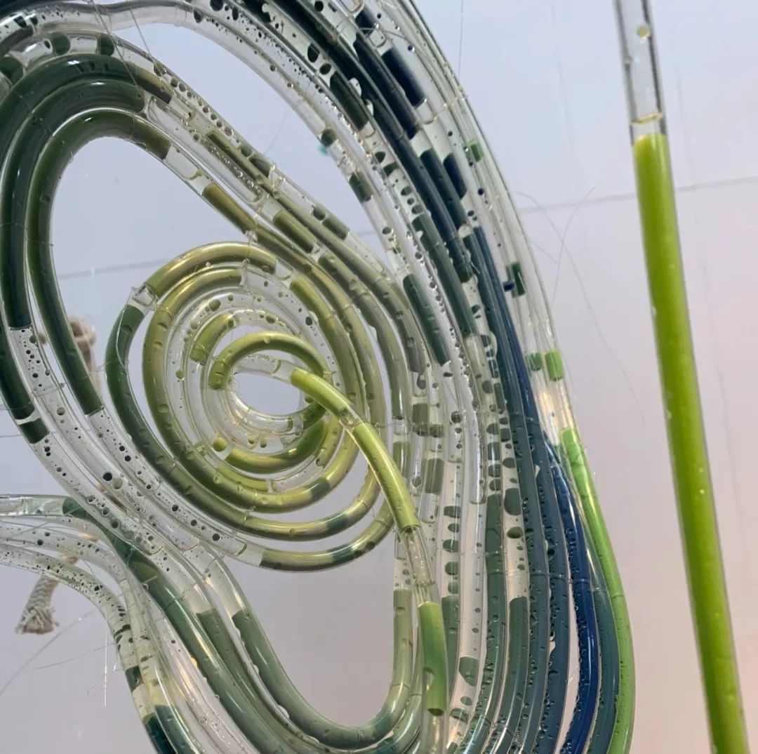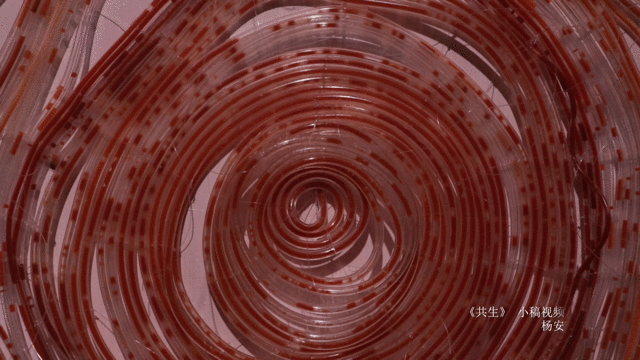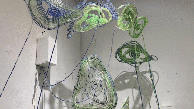 作品释义:用渔线盘绕软管成片状,盘绕的缠结证明了物物之间的生命联系,片片水源循环而流,看长势给人生机盎然之像,根系漂浮不定,像完成了某项新旧交替的使命一般。
