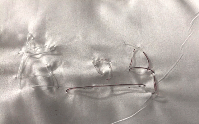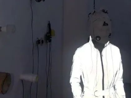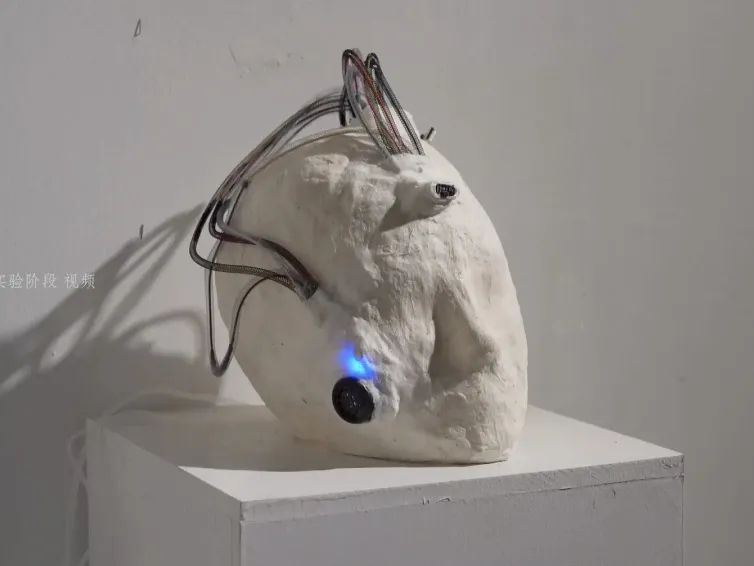 作品释义:一个椭圆形的生命体⻓有四个肢体,在它腹部的腔内还存在着另一生命体,并且其手部从中伸出,环绕着包裹它的生命体。材料选用化纤布料,营造柔软、新生生命的感觉。眼睛在闪光灯反射下会呈现出动物虹膜的形状。上方的电机能够控制其肢体扭曲纠缠在一起,展现不同个体共同生存这一主题。
