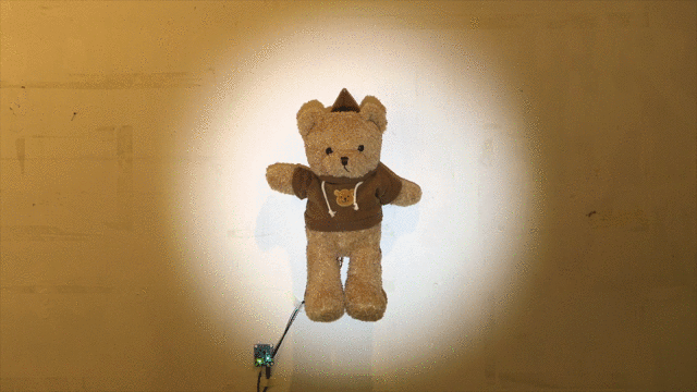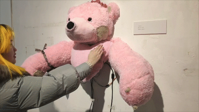 作品释义:使用距离感应装置控制舵机摆臂,让玩偶做出拥抱的动作。现代社会中人们的距离因种种因素被拉近,同时心灵的距离却开始疏远。只有怀有真诚,真正触摸到心灵的交流,才能得到同样真诚的回报。