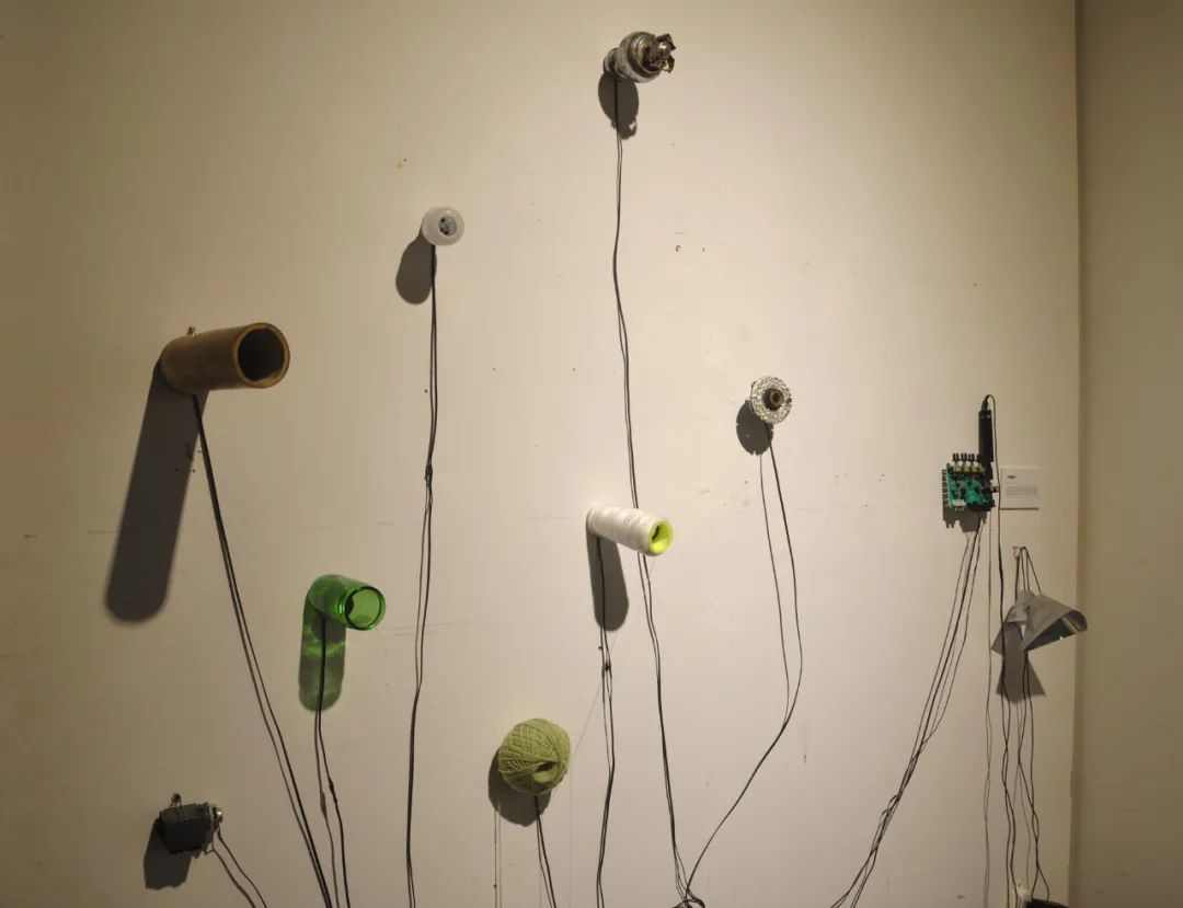 作品材质:电线、小型喇叭、功放板、玻璃、竹子、毛线、铁、塑料、麦克风、废弃物