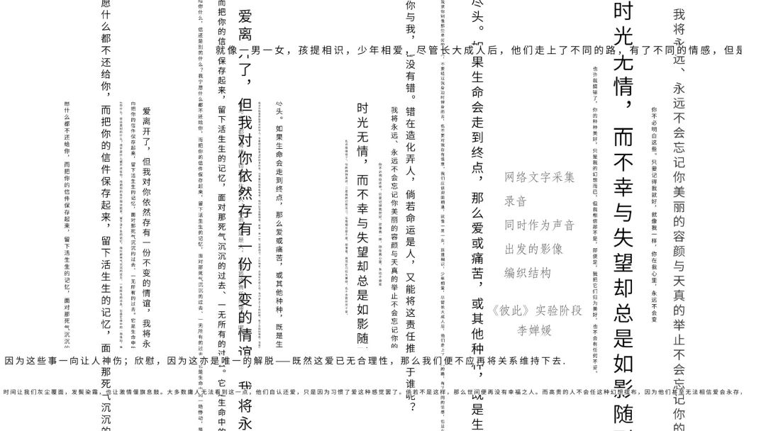 取材于若干对曾经相爱过又最终因各种原因而分开的情侣的分手书信,当两个人决定在一起时,彼此的命运交织在了一起,共同经历过许多事情后,有些人选择分开,之前生命交织的种种最后也会化作记忆碎片。磁带的编织结构,使声音碎片化,原本话语中表达的情感变得模糊不清。