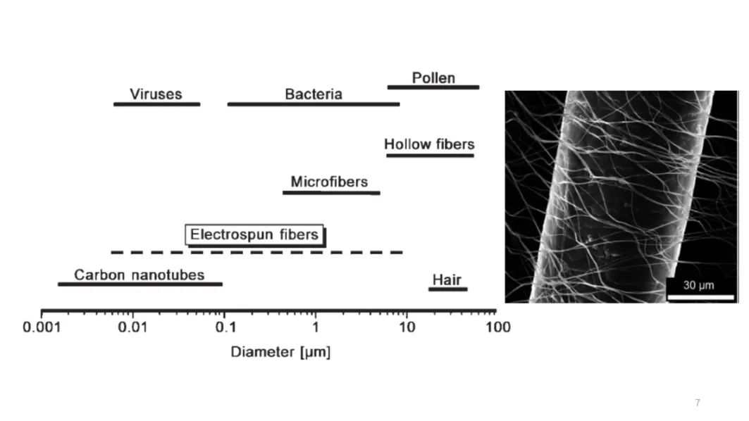 纤维超细化是一个重要方向。普通纤维直径5-50um,蚕丝直径4-5um;纳米纤维的尺寸较广,广义上,1um以下的纤维均科称为纳米纤维。