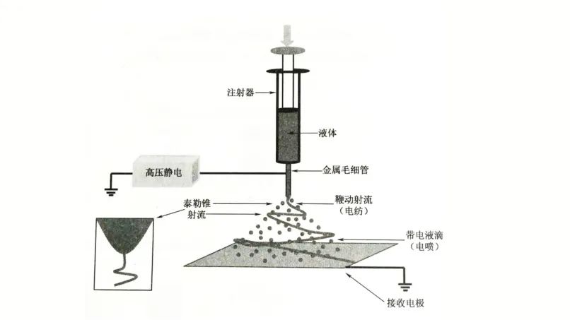静电纺丝的基本设备包括:高压电源、喷丝头、接受装置