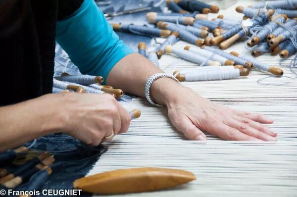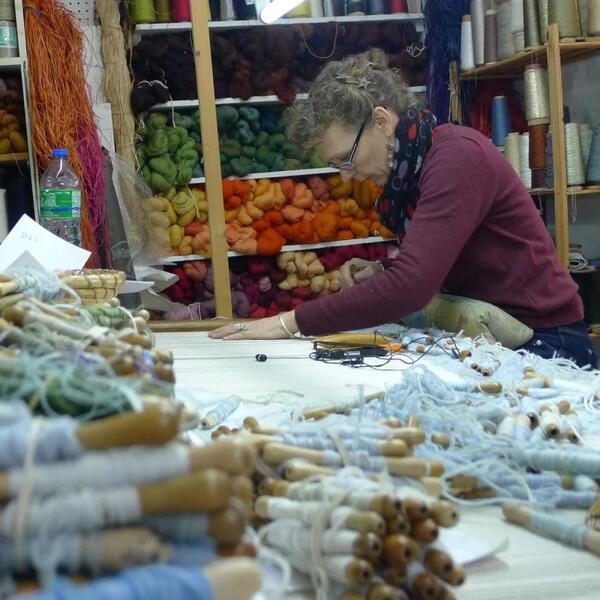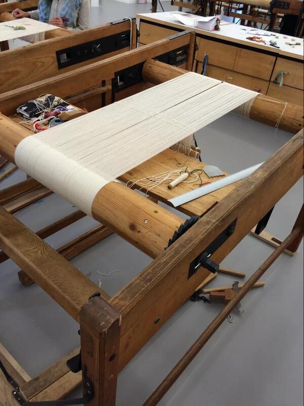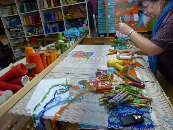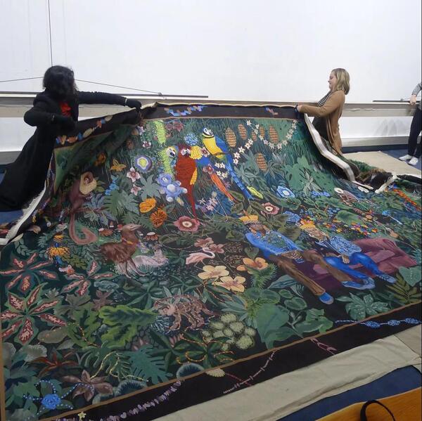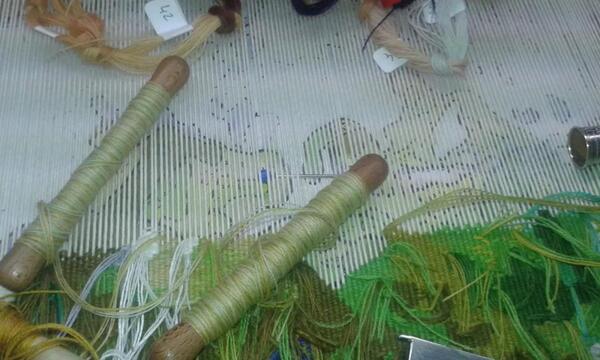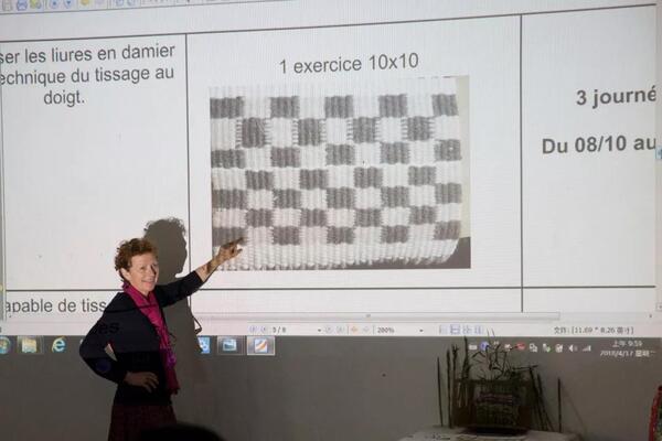 展示壁挂作品的同时,弗朗斯奥黛丽阐述了传统挂毯的制作过程和编织技法以及学生的课程安排。壁挂中心的老师分工明确,学生通过学习绘制底图、颜色运用、编织技法等不同课程并加以实践,在两个学年中掌握奥布松壁挂“反面编织”的技术。纤维艺术系师生也对“反面编织”这一技术产生了浓烈的兴趣,通过问答环节对此技术得到了更深刻的理解。