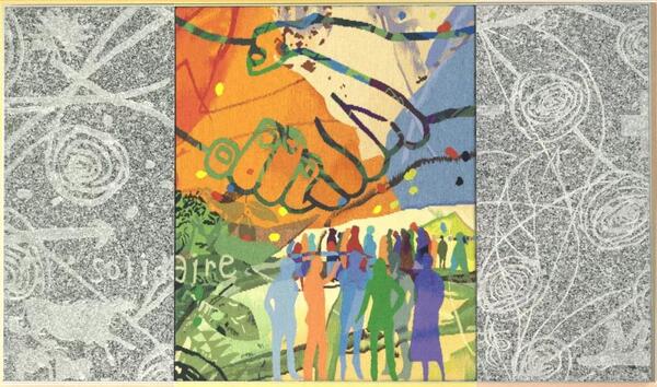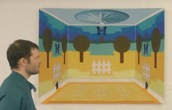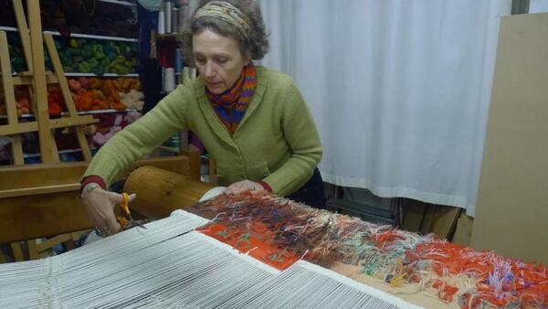 弗朗斯奥黛丽从事壁挂事业已经有四十余年。在讲座中,她通过壁挂作品图片的展示,首先简要介绍了艺术家与奥布松壁挂工作室的合作方式:艺术家绘制图画,再将其转化为壁挂底图,最终由奥布松的壁挂工作室制作成挂毯。如2013年第一届杭州纤维艺术三年展的参展作品《全景复调》,就是由艺术家赛瑟里·勒·塔莱克与弗朗斯奥黛丽的工作室合作而完成的,壁挂呈现了一幅光谱声音景观图,图案来源于鸟鸣的声波图。
