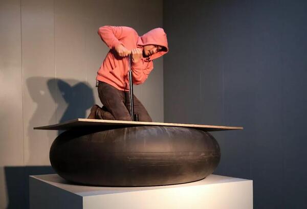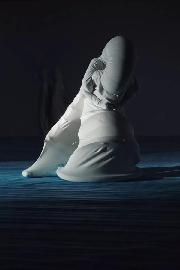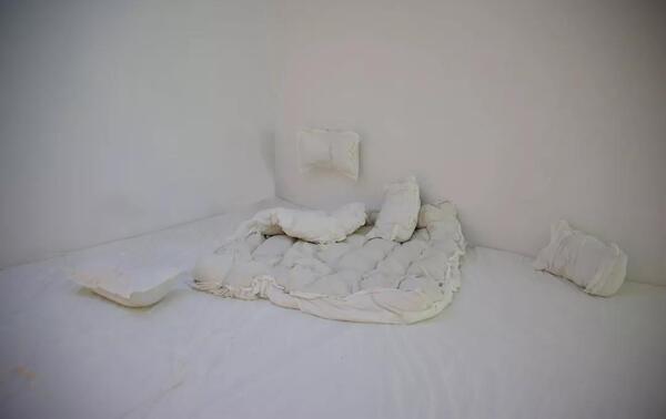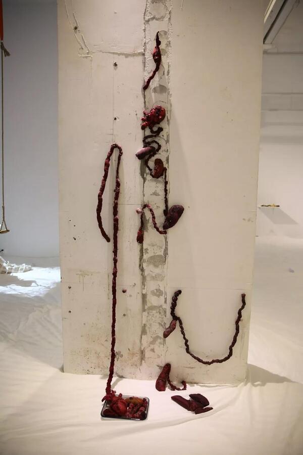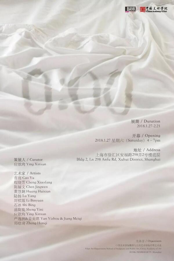 纤维和身体,是最为日常和理所当然的关系,这种当然性形成了一种常态,但是当我们看到熟悉的日常有些错位时,那种熟悉的陌生感就产生了一种能量的转化,在脱离标准化的可能性中形成无限的可能,新的状态在“非常”中生成。在此次“0:00”的展览中,地面被做成巨大的柔软的床,人们可以在展厅白色床单中躺卧,私人卧室与公共空间相混淆,观者以“日常”的个人化的“0:00”时分的身体状态,在不合时宜的场所中触发一种超出经验的身体体验,此时“日常”成为了“非常”。当我们无法形容一件事物超出了某种范围所处的状态时,通常会用“非常”这个词来表达,蕴含着对立于“正常”的战争以及对于“僵化”的处理与自由的创造,在“似是而非”的体验中,新的感知生发于其中,在这种极端的临界状态下,事物处于发生质变的临界点上,或者已然开始了改变。