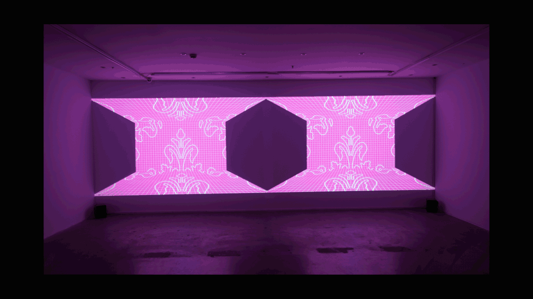 无论是“纹”还是“线索”,都会产生一种暗示,彰显一种编织的文本形式,以此产生一种纤维式的寓言。而这一再编织的文本形成了“爻”一般对于未来的畅想,并以此展开一种有本可依的可能性的探索。《再编码--纹样XI--Laforet的砖片》通过技术处理后的“织”与“纹”呈现出了一种未来感,反复交织的纹样与数字化的运行轨迹似乎在临摹一种人类编织的劳作形式,但它同时也架空了这一真实的实在性,将莫名的“织物”悬置在黑色的真空中——这似乎是某种实在记忆的消退,也似乎是悬而未决的世界的开启。