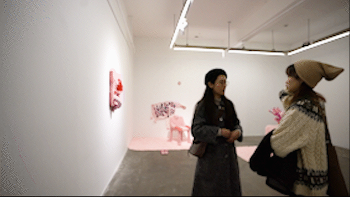 在展览的经营中,开头的《佩涅洛佩的情书》以无休止的编织开始,它既象征经纬的编织结构与复杂情绪的反复,又象征一种古典主义的时间感与叙事。展览的尾声是《再编码--纹样XI--Laforet的砖片》,以一种未来式的语言方式进行展开,融合某种科幻小说式的风格与独白,在影像中呈现的钩针纹样象征了结绳式的编织形态,以此呼应开头的经纬结构。其结尾的设计更像一种如《星际传奇》般的开启,以此形成一种重新开始的循环,并对展览产生一种倒叙的回看。因此“xx”的展览是一个正叙与倒叙的交叠,在这样的循环中,以《线上聚会》作为中转站,进入“织”与“交流”的枢纽,以《还是很想你》开启一个复杂情绪的空间。本次的参展作品不是简单的对应关系,也不是对于“编织”的单一性层次的描述,,而是在不同程度上彰显了“织、纹、索、现”的精神内涵,作品中所传达的思考与情感的细腻都是这些问题的回馈与扩展。
