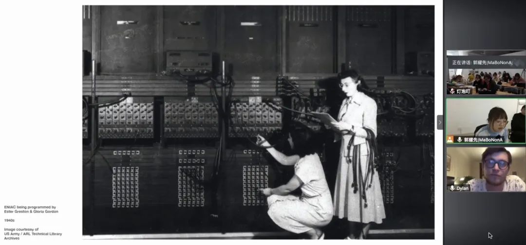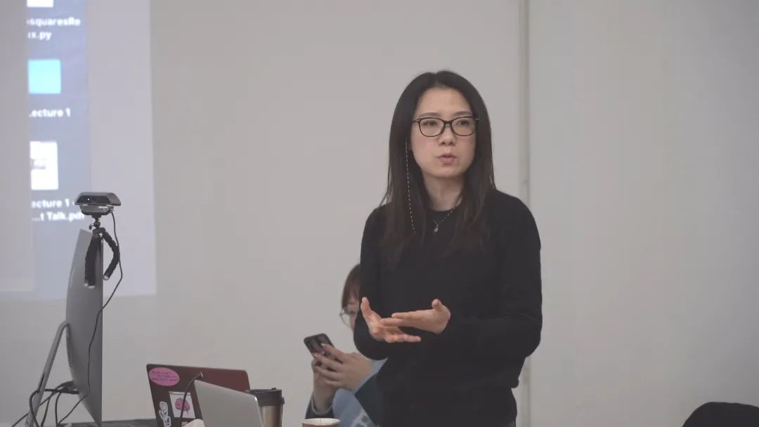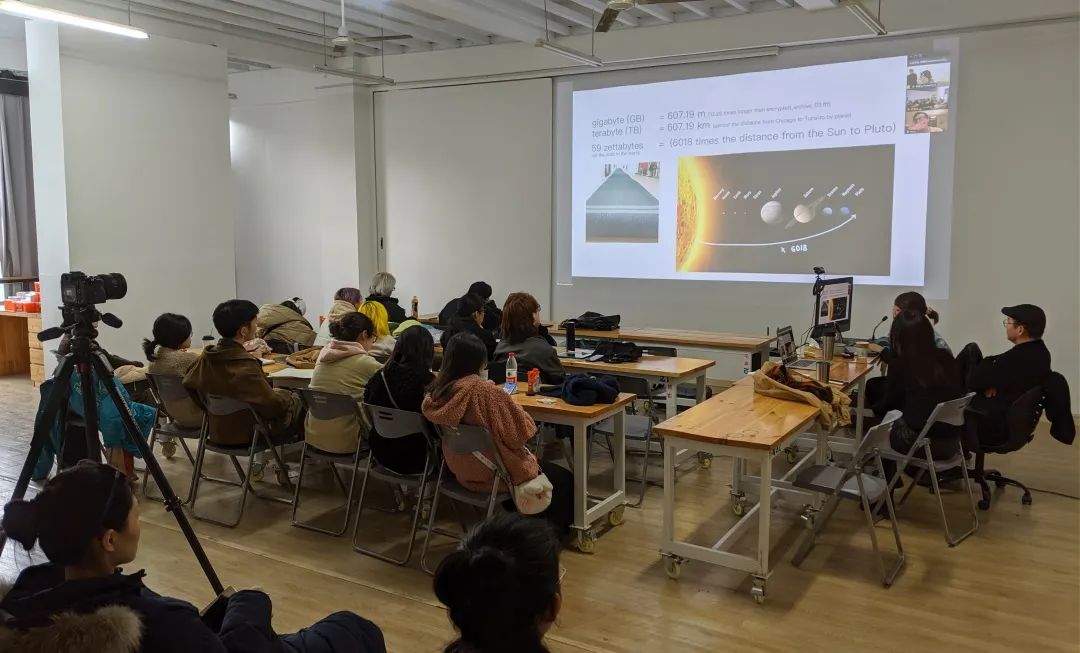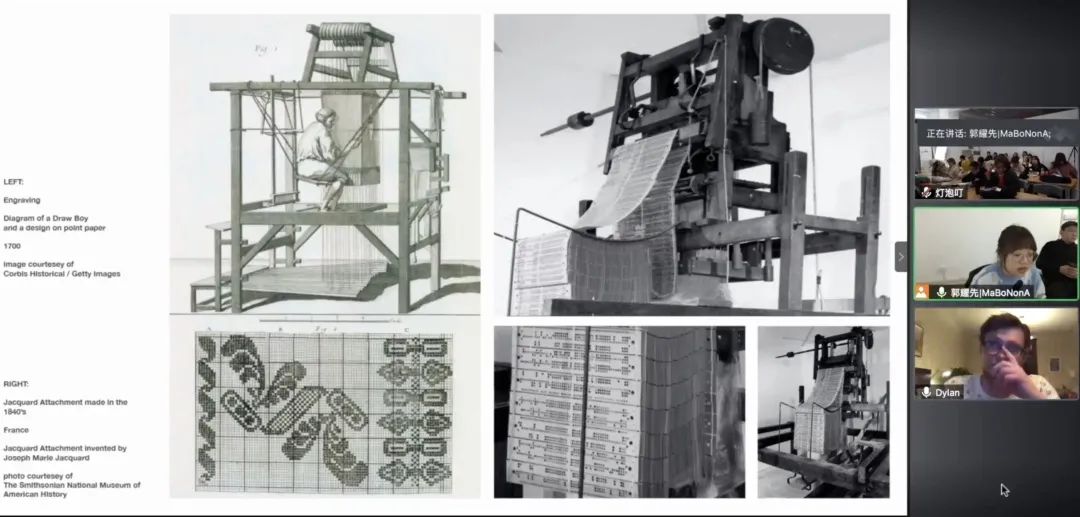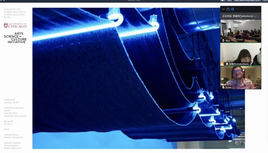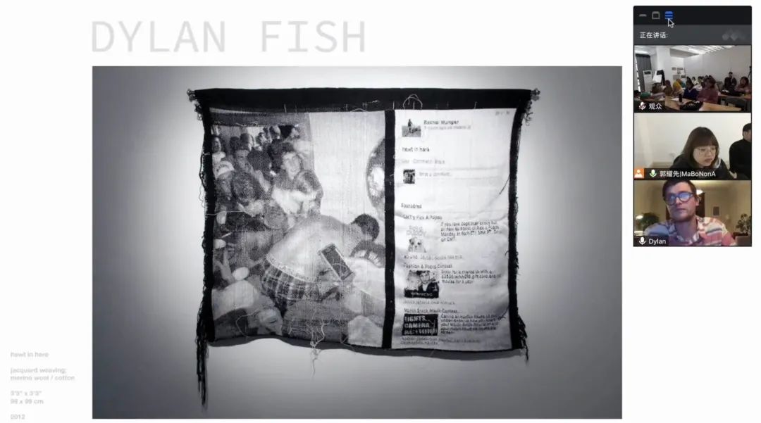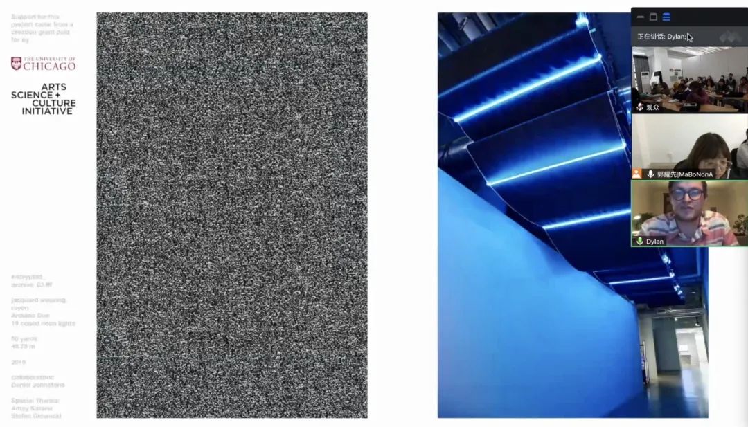 艺术家迪伦·费石 通过在相关领域的交叉点和边界上的研究,向同学们分享了信息进化的历程,展现了信息和数据的“形态”与“织物的界面“之间深深的羁绊。