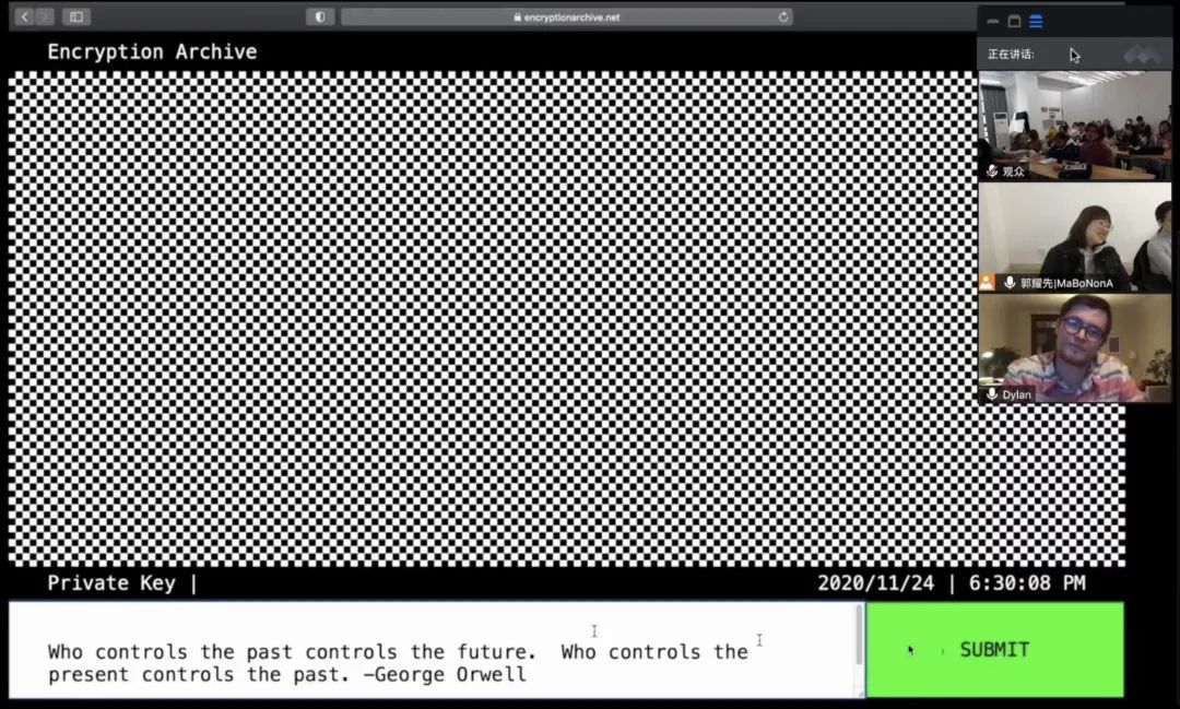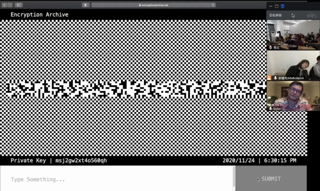 迪伦剖析了他的艺术项目“encrypted _archive _03.fff”的开发和与创造过程,阐释了该艺术项目对他的重要意义,该作品是一个信息档案,同时它又是一种“织物”存储着数据。