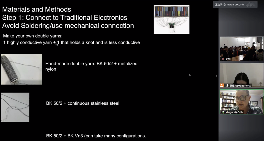 在线讲座截图,作品技术原理及金属纱线种类的特性