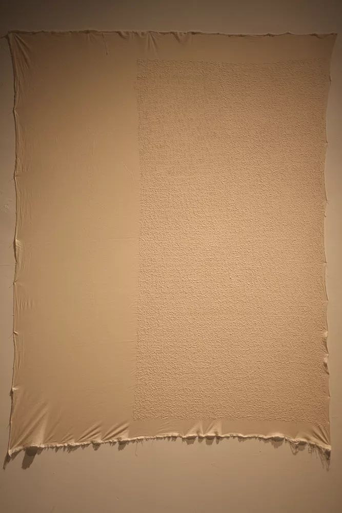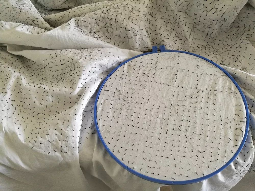 父亲去世后,我眼前常常浮现出他在世时的样子,我很想有所表达。我想到席琳·迪翁的《与父亲对话》,想到往生被,想到......。我扯了一块单身床单大小的白色棉布,找到相同的棉线,照着《金刚经》经文绣起来......这种“诉说”本来就是面对自己的,无需让观者辨识清楚,看到的只是密密麻麻的痕迹。布满密密麻麻痕迹的白布就是我的作品要追求的效果。作品还没完成就被要求拿出去参展,作品怎样算是完成?