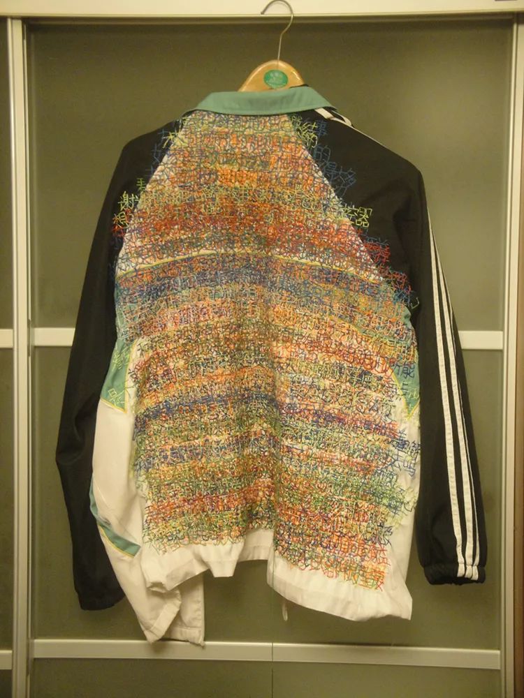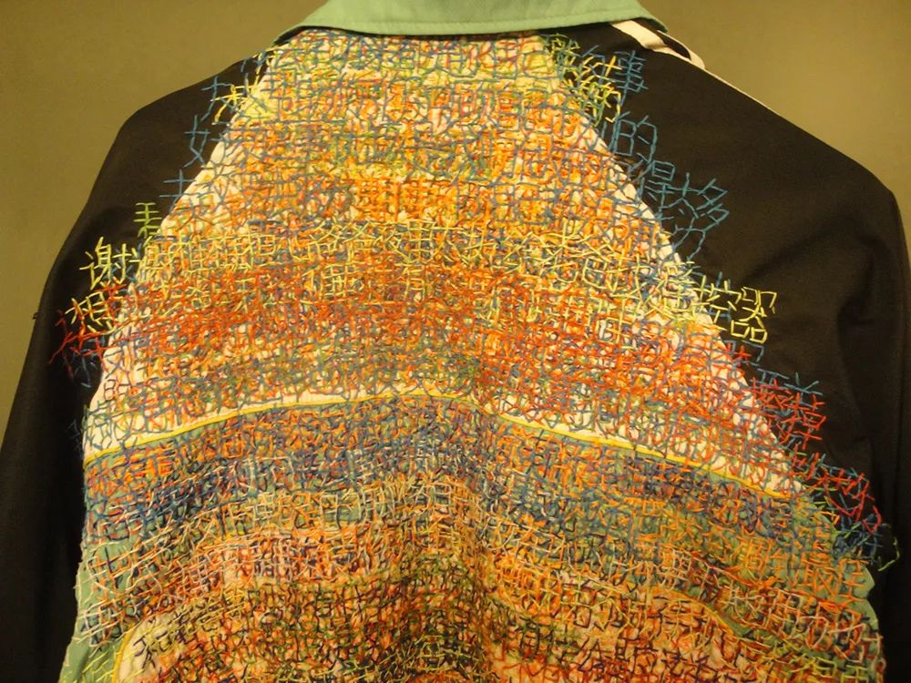 当我孩子上初中后,明显感觉作业量增大,学习竞争也更加激烈。随之而来,他母亲对他的关注度也大大加强,每天检查他的作业,了解他在学校的表现,然后或批评,或鼓励,或要求向他的某位同学学习等。我坚持每天把他母亲的话记录几句,一直到他初中毕业。同时我开始将记录的文字用针线绣在他的一件校服上,直到雕塑系系展开幕。我想借助这样的方式,表达母亲在孩子成长过程中的那种心情和愿望,记录父母和孩子共同度过的那段时光。
