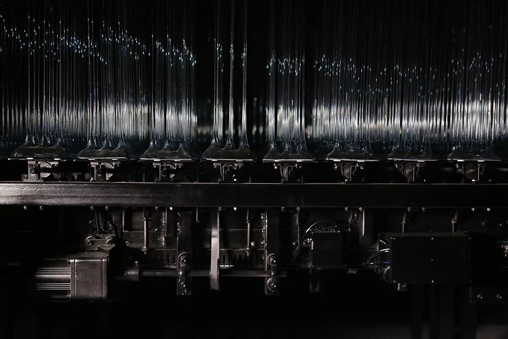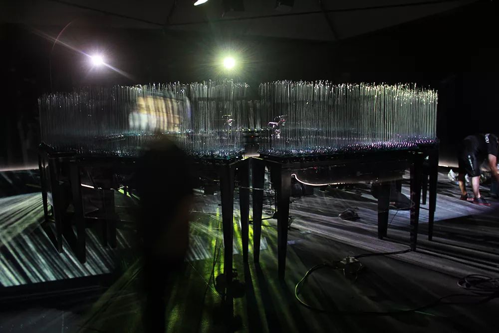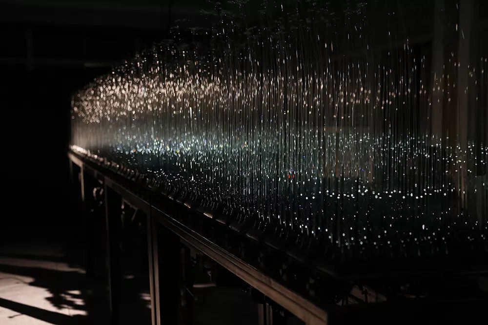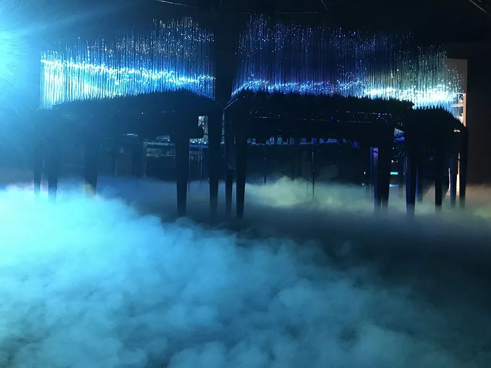《天境之音》将独特的技术与艺术的造型语言,结合科技手段,将声音、光电、雾气、装置与玻璃材料融汇在一起,展现出完全不同的艺术形式。这件作品由线性玻璃机动装置、雾、声音图像采集与投射系统组成,通过程控处理音画的实时采集与同步叠加,旨在营造一个声与像即时n次方反复映射的实虚镜像空间,凸显在场性沉浸体验,触发观者对现实与现实之间反复映射的思考。