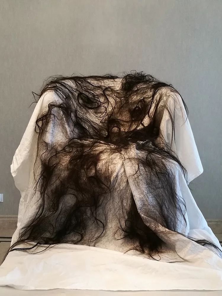 借助虎皮交椅的形式,本人通过沙发、床单、头发等物品加以替换改造,作品呈现出一种新的意味。