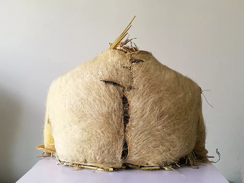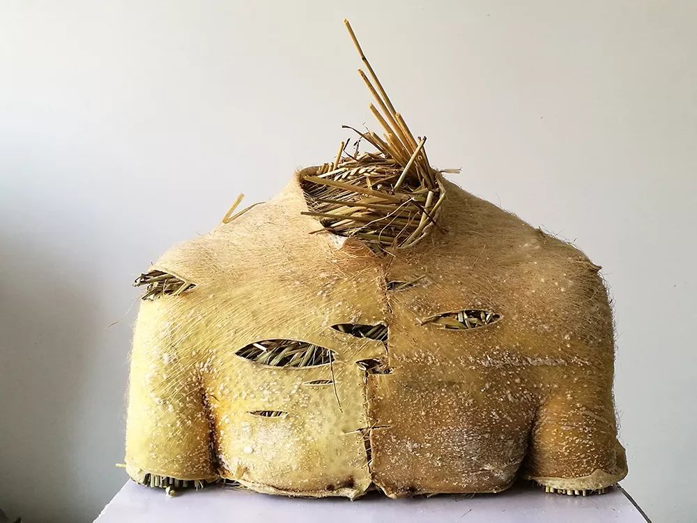 《胸像》 Bust 生猪皮、稻草、粗线/ Raw pig skin, straws, thick strings53cm×40cm×30cm 2019
