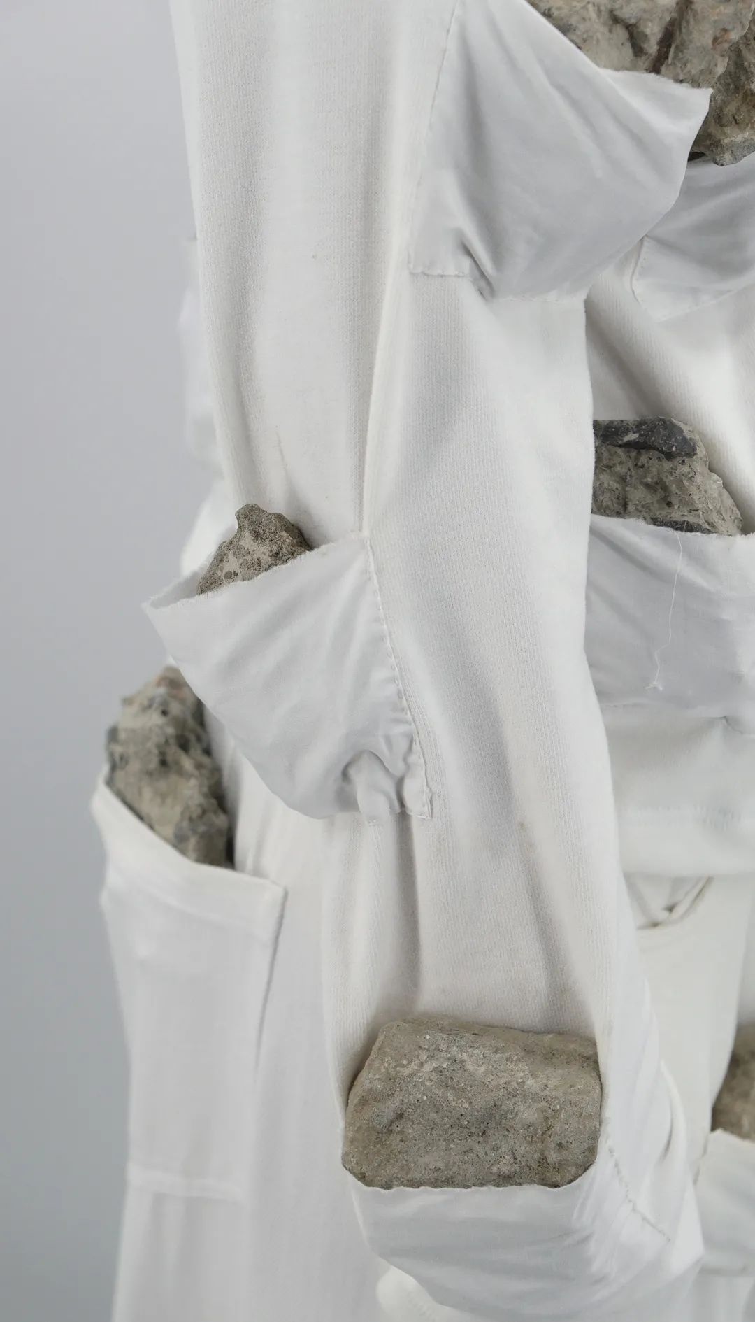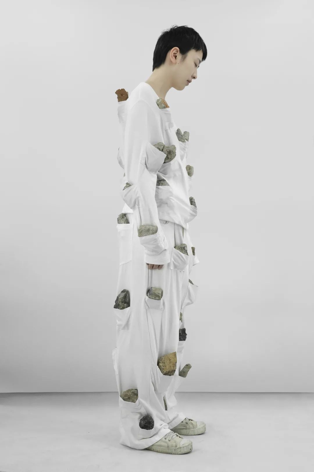 作品介绍:《无用的重量》是艺术家负重30kg的石头保持站立的形象。作品基于一系列女性用布将小孩背在身后的形象为初始材料进行创作。但母亲作为一个照顾者、奉献者从而丧失一定自由的状态其实在每个人身上都可见。进而艺术家将背在身上的重量抽象化为石头,将“背”这个行为抽象化为衣服上的口袋,并以数量去加强表现。当人与人之间的关系转化为人与石头(重量)之间的关系后,作品形象从一个受难者变成了一个更永恒的“基础的人”的基本生存状态。