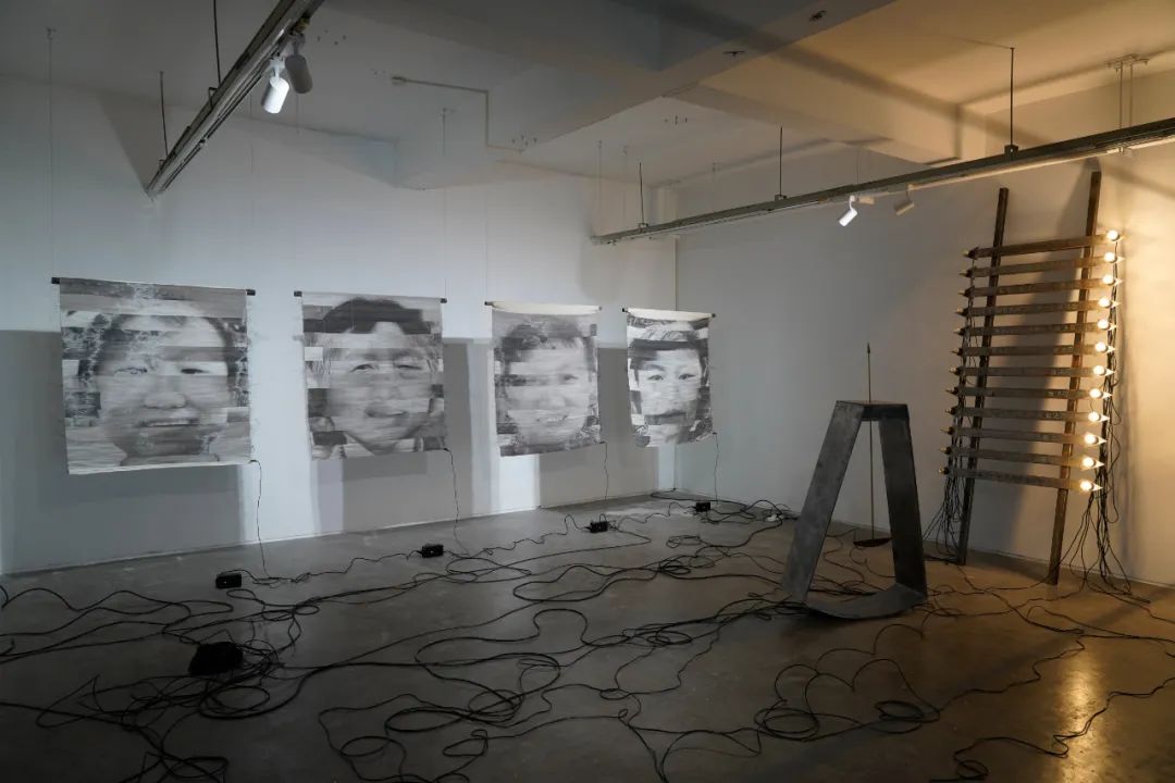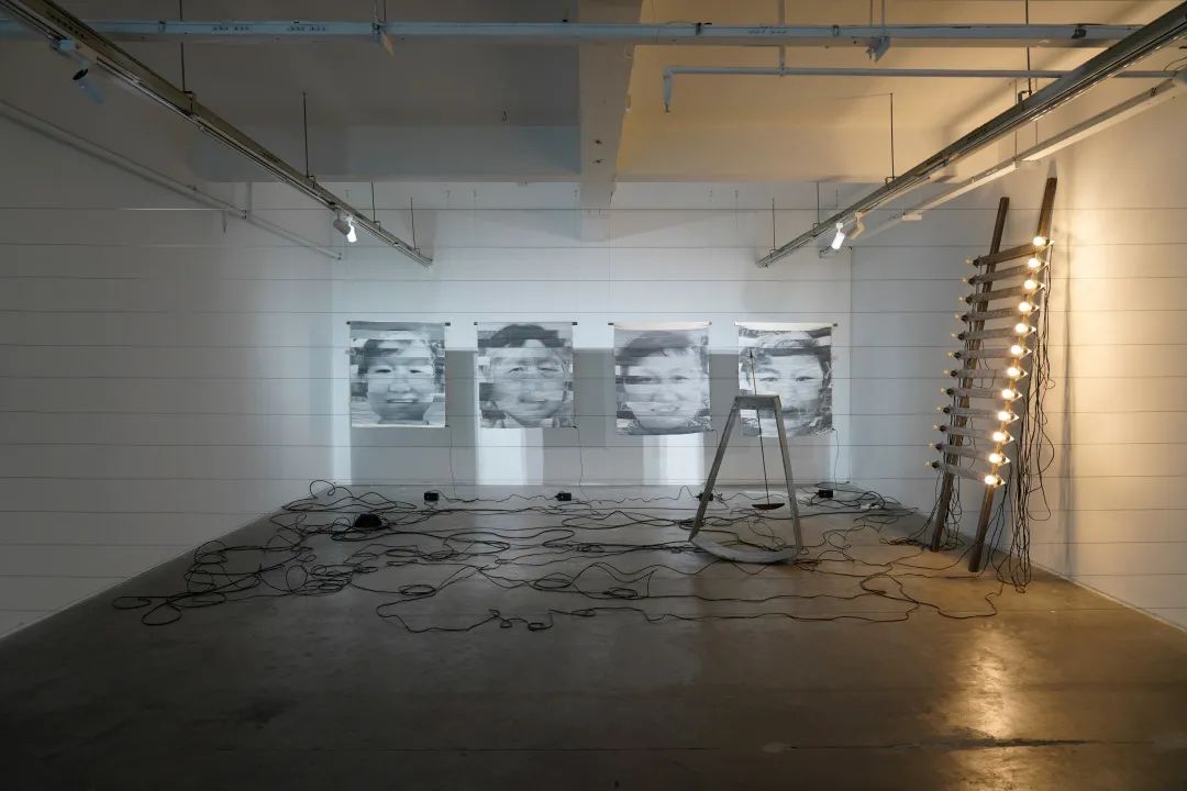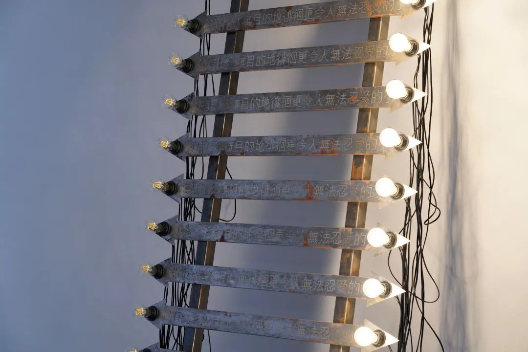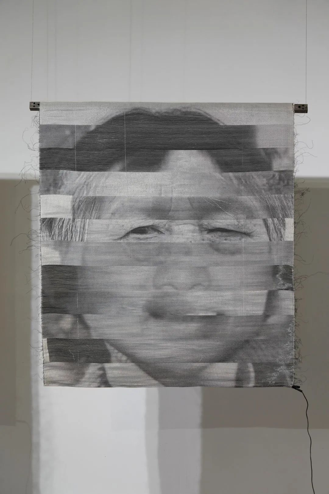 作品简介:作品呼应了《荷马史诗》中佩涅罗佩的故事,也是女性与时间、身体与机杼、消耗与增长的故事。故事中,织布机成为了佩涅罗佩的时间线上的控钮,而织物则意味着凝固的时间。作品中,双向箭头的指示牌、重复出现的文字、不断明灭的灯光、化身节拍器的箭镞与梭子都指向了纺织中漫长、反复、枯燥又不可抗拒的时间经验。织毯中包含了同样的时间策略。缓慢生成的织物与日渐衰老的面孔,形成了一种织物与身体上间易察觉的相关性。一万梭的壁挂以铁丝为纬,外婆、母亲和自己的形象混合塑造,亲代间的面孔都有着相似模子的痕迹,又不断消磨着各自的边角。静默的电流在经纬与血缘中间穿过,日常的情感细微敏感,让人发麻,但却是不可触摸的禁区。