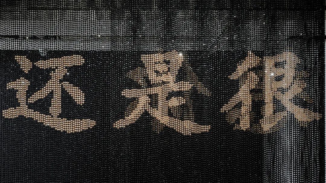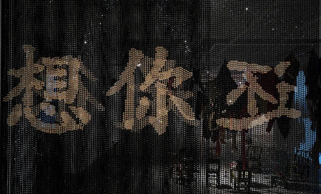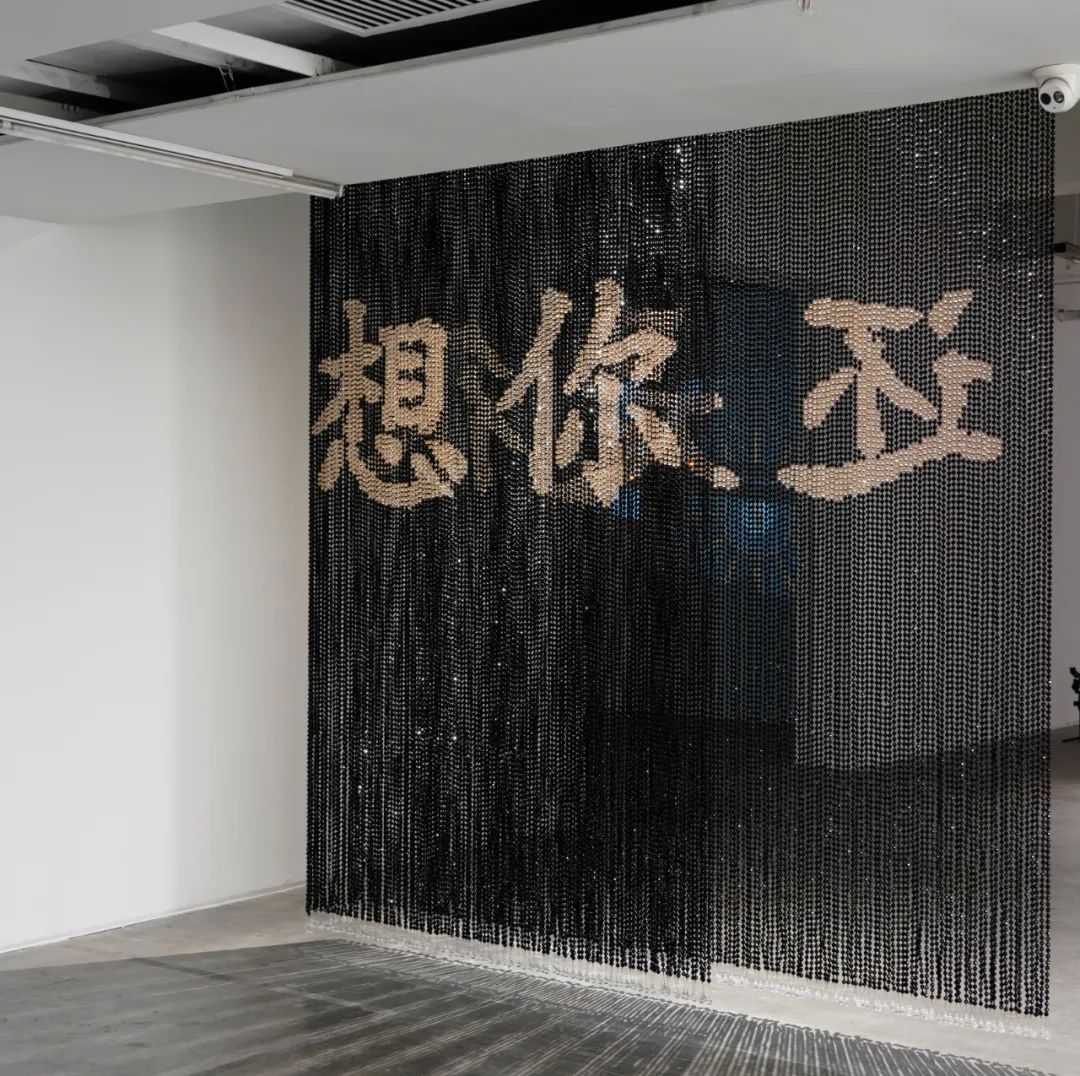 作品介绍:我用水晶珠串出一个帘子,隔开两个空间。其中金色的珠子摆出一句话“还是很想你”,穿过这个帘子,这句话便打散了,在黑暗中闪着细碎的光。慢慢地,这行字又恢复了,安静地待在那里,等待着…