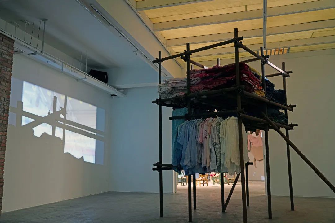 作品介绍:每当我整理衣橱的时候,就好像看到我自己、我的生活和记忆。我们在城市中生存,人、城市和生活交织在一起,成为一个整体。我收集了来自社会大众的衣服,这些风格、颜色、尺寸各不相同的衣服都映射出原来主人的个性,当我把它们一件件地叠起来,仿佛在整理这些人的记忆,它们在讲述着不同的故事。脚手架总是见证着城市的变迁,载负着城市的历史,在这里,生锈的脚手架成为了展示的衣橱,投影仪里放映着我用镜头捕捉的城市瞬间,城市的记忆、人的记忆、生活的记忆、我的记忆成为了一个集合体,通过整理的日常行为将它们编织起来,赋予了它们意义,同时也沉淀了历史与时间。